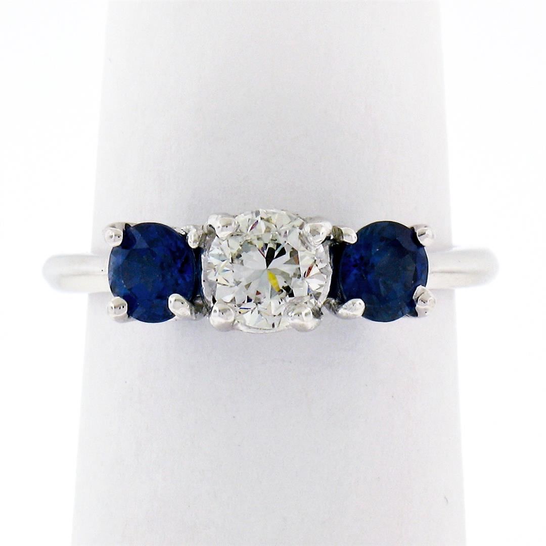 An estate solid platinum 3 stones band ring, featuring 1 round brilliant cut natural diamond (G - VS1; 0.52ct ), and 2 round brilliant cut natural sapphires (0.80ctw). The ring is size 4.5, weighs a total of 3.85 grams, and measures 5.0mm wide.