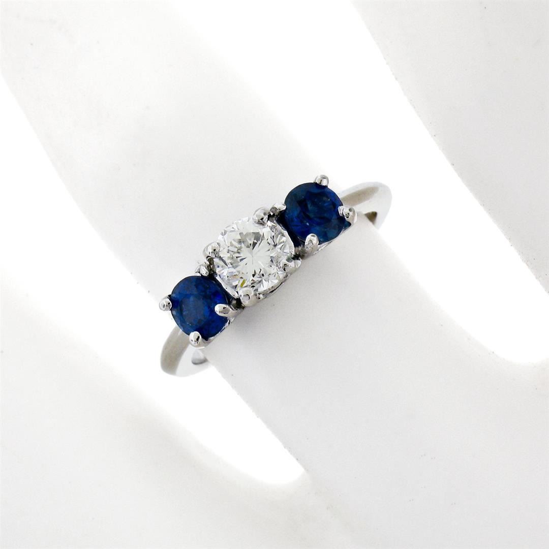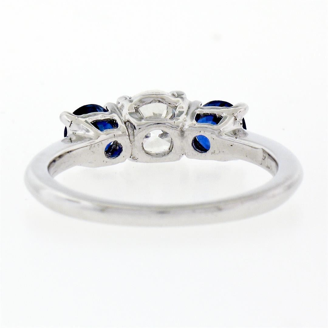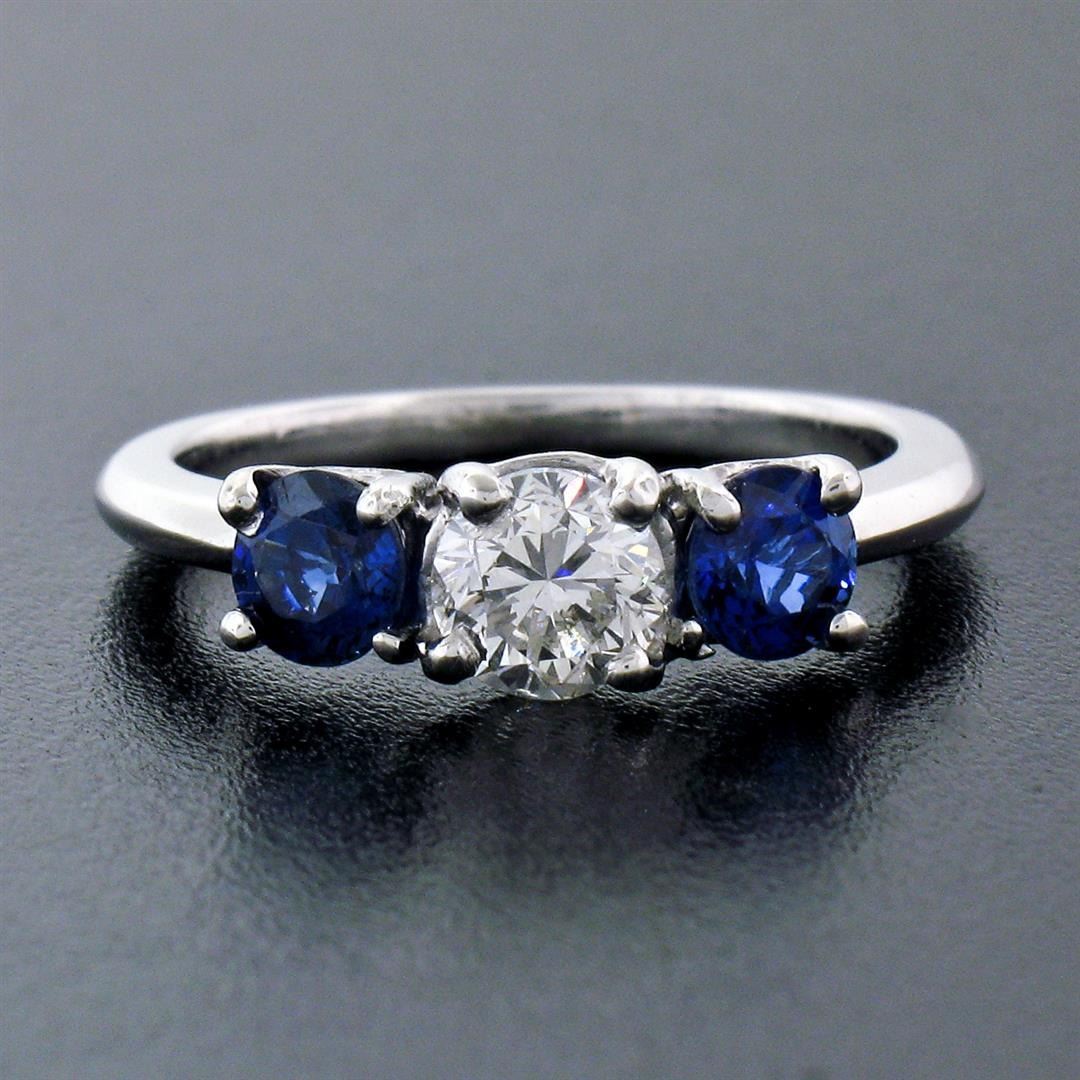 An estate solid platinum 3 stones band ring, featuring 1 round brilliant cut natural diamond (G - VS1; 0.52ct ), and 2 round brilliant cut natural sapphires (0.80ctw). The ring is size 4.5, weighs a total of 3.85 grams, and measures 5.0mm wide.