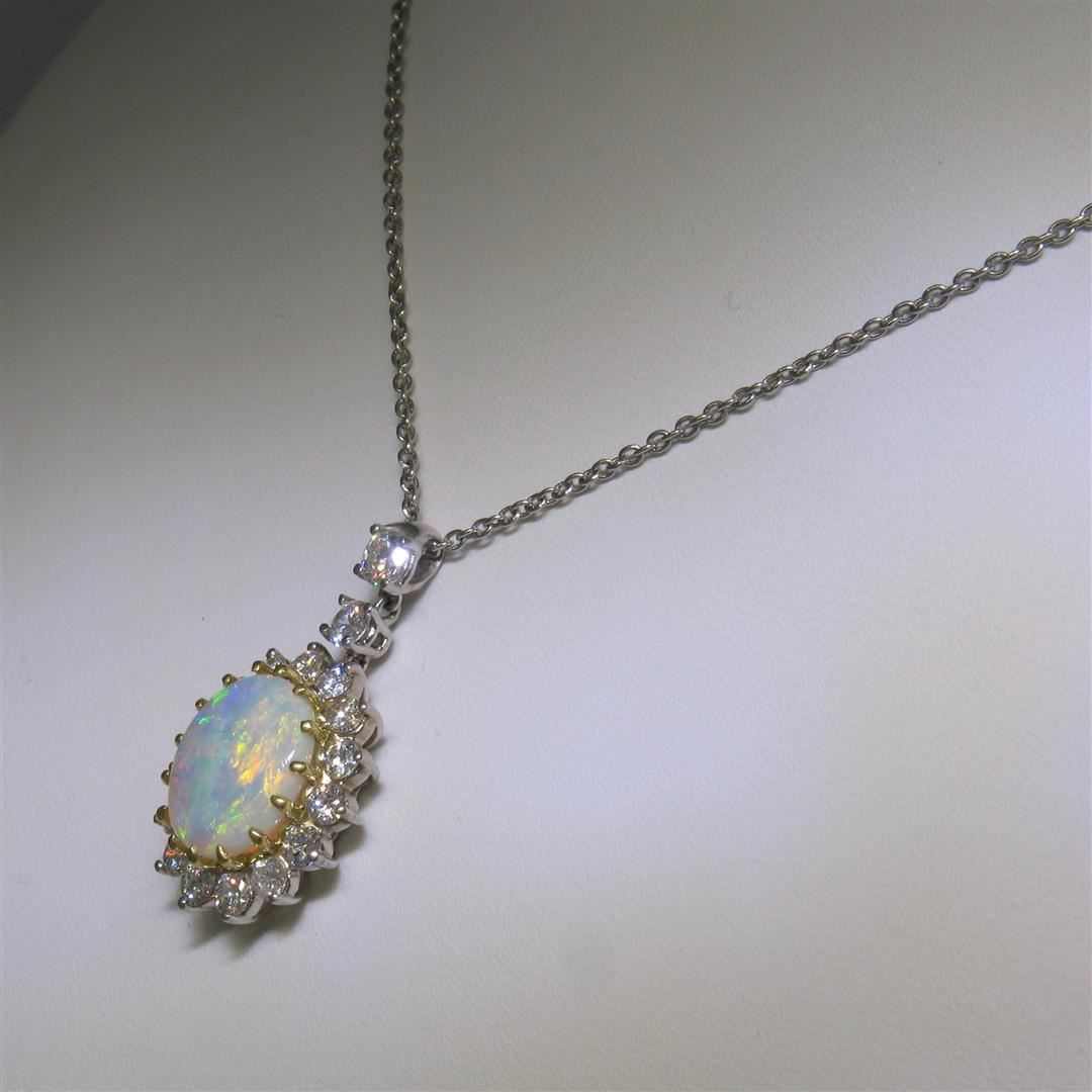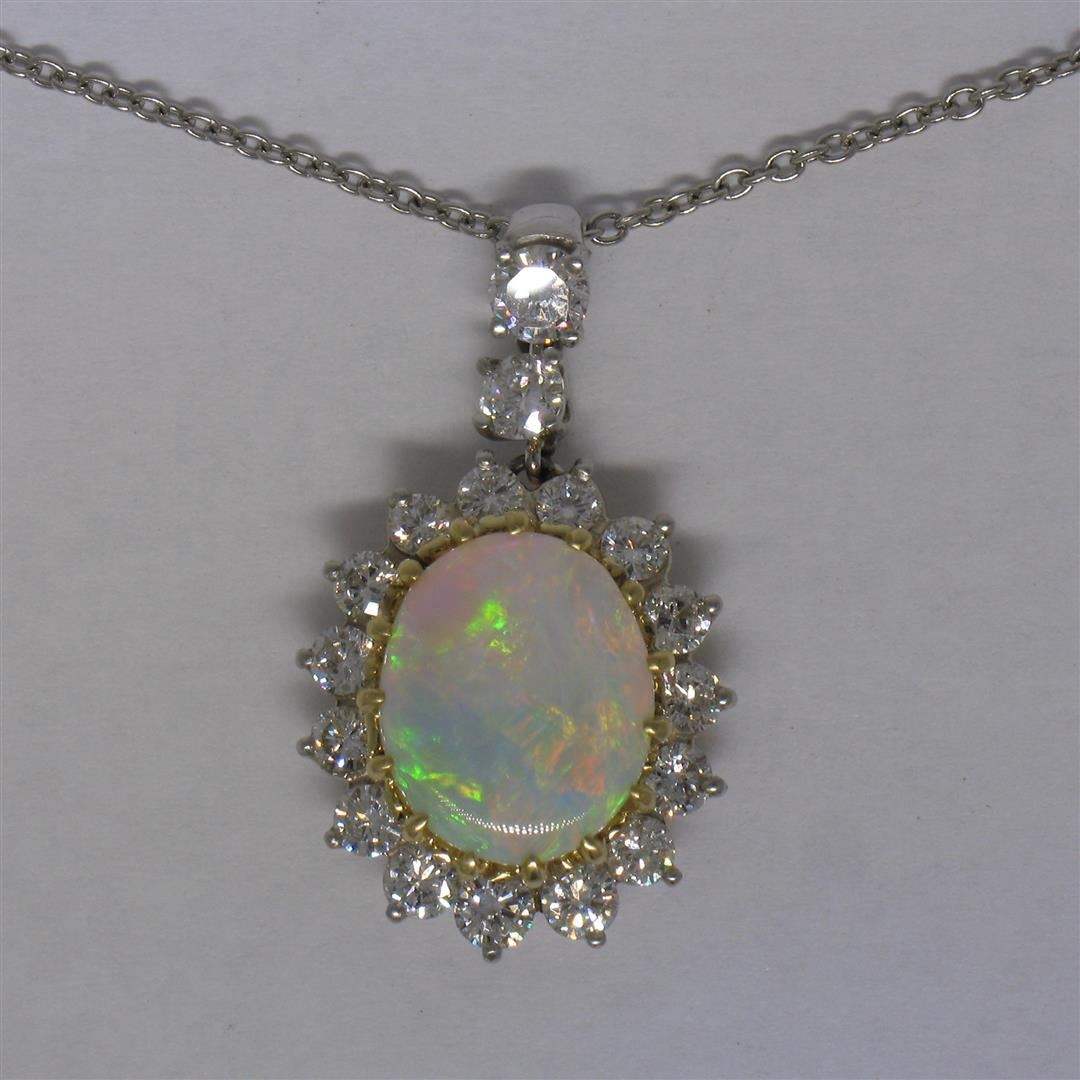 An estate solid platinum and 18k yellow gold pendant necklace, with 1 oval cabochon cut natural opal (12.2x10.0mm - 2.33ct), surrounded with 17 round brilliant cut natural diamonds (E/F- VVS2/VS1; 1.36ctw). 18 inch cable link chain, 7.54 grams total weight, pendant measures 28.70x16.25mm.