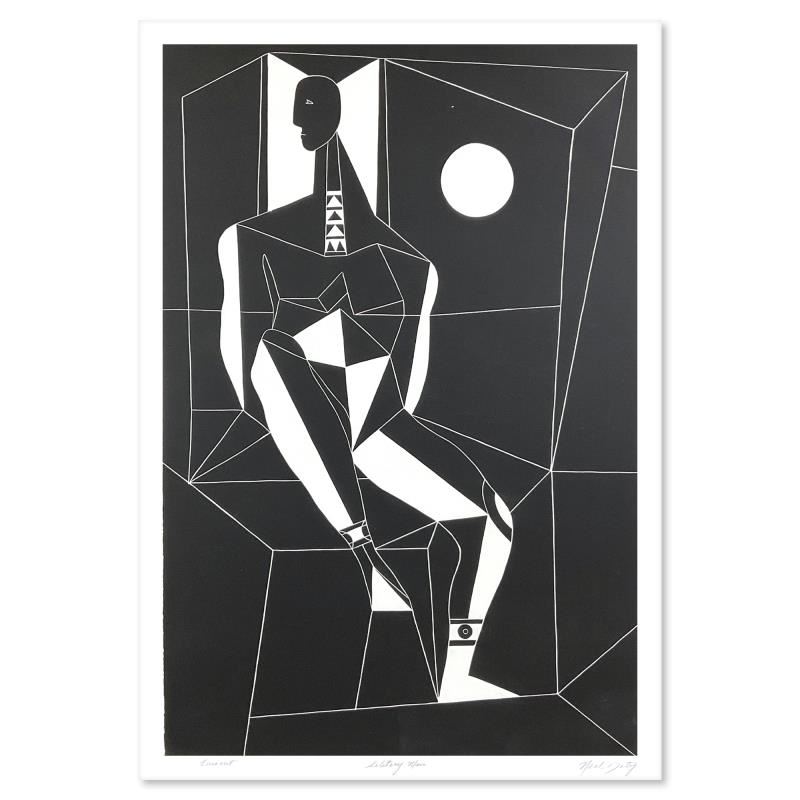 "Solitary Man" is a limited edition linocut on paper by Neal Doty (1941-2016) numbered and hand signed by the artist. Includes Letter of Authenticity. Measures approx. 29.5" x 40" (border) 23.5" x 35" (image). There are imperfections on the image.