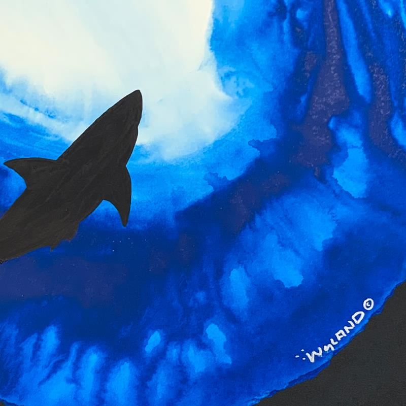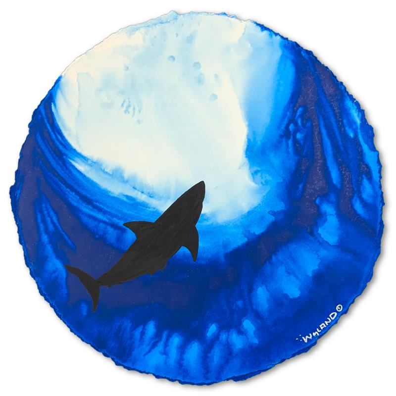 "Solitary Shark" is an original painting, watercolor on deckle edge paper by Wyland. Hand signed by the artist, the piece comes custom framed and with a letter of authenticity. Measures approximately 30" x 30" (framed), 19.5" x 19.5" (image).