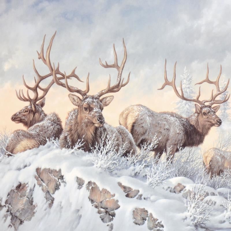 "Solstice Rendezvous - Elk" is a limited edition lithograph on paper by Larry Fanning (1938-2014), numbered and hand signed with a Letter of Authenticity. Measures approximately 32.5" x 20" (image).
