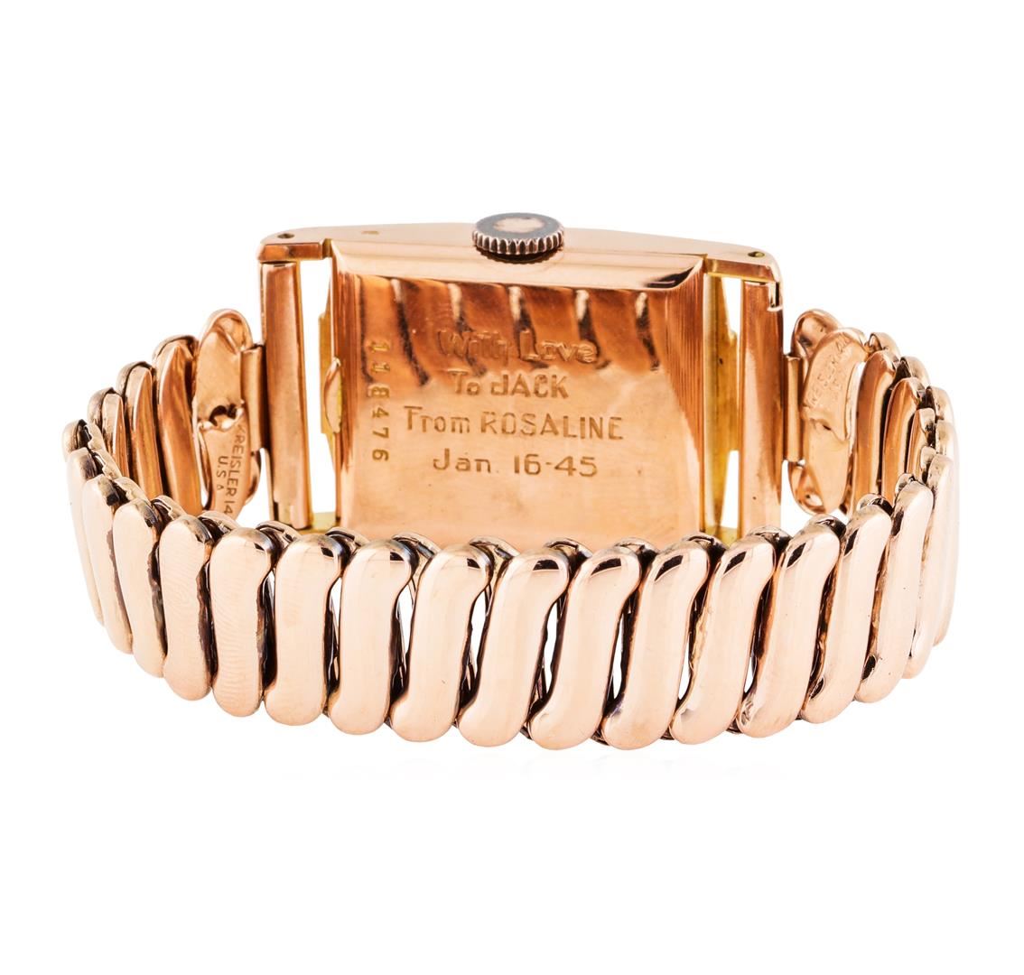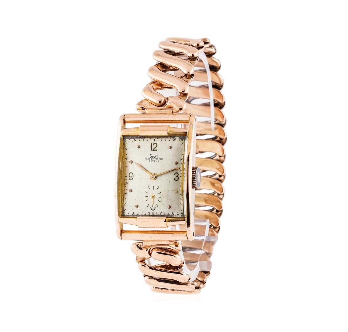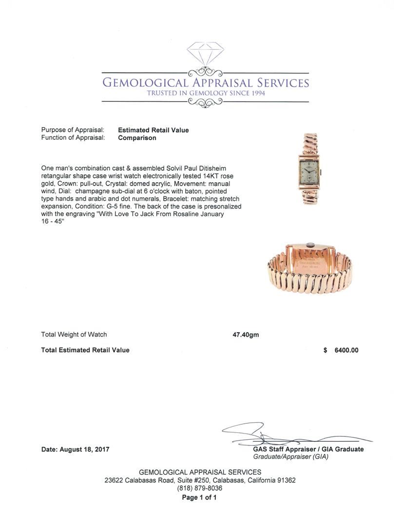 One man's, combination cast & assembled Solvil Paul Ditisheim retangular shape case wrist watch electronically tested 14KT rose gold, Crown: pull-out, Crystal: domed acrylic, Movement: manual wind, Dial: champagne sub-dial at 6 o'clock with baton, pointed type hands and arabic and dot numerals, Bracelet: matching stretch expansion, Condition: G-5 fine. The back of the case is presonalized with the engraving 'With Love To Jack From Rosaline January 16 - 45'. Total Weight of Watch 47.40gm GAS Appraised at $6400.00. GAS Appraised at $6,400.00.