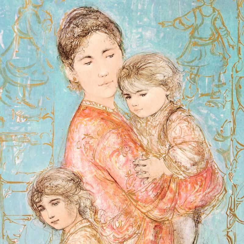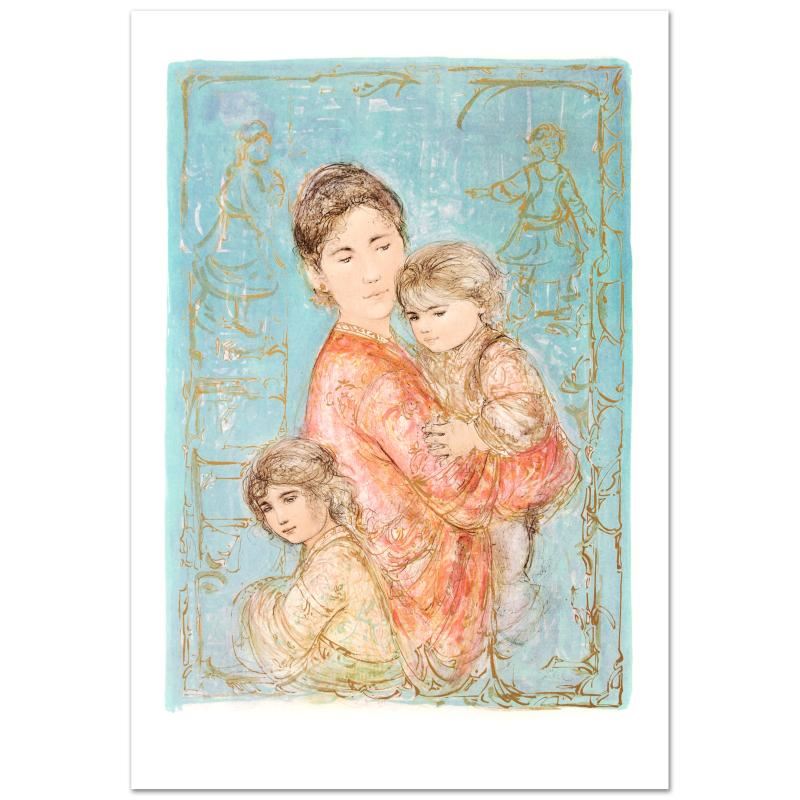 "Sonya and Family" is a limited edition lithograph on paper, numbered and hand signed by Edna Hibel (1917-2014). Includes Certificate of Authenticity! Measures approx. 25" x 36" (with border), 21.5" x 30" (image).