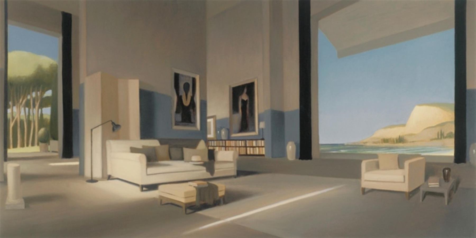 The modern layout of an upper-class home, which includes two large paintings of women, book shelves, and seating arrangements below voluminous windows, overlooks magnificent outdoor views in this oil painting by contemporary French artist, Thierry Mysius.