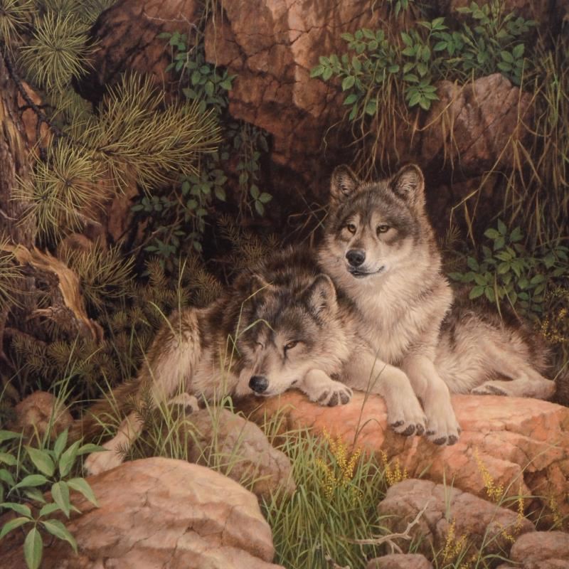 "Soul Mates - Gray Wolves" is a limited edition lithograph on paper by Larry Fanning (1938-2014), numbered and hand signed with a Letter of Authenticity. Measures approximately 23" x 18.5" (image).