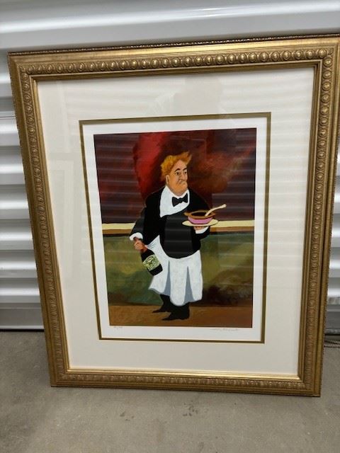A framed serigraph featuring one of renowned French artist Guy Buffet's surly Chefs. Piece # 45/195 . It is 28.25x24" framed .