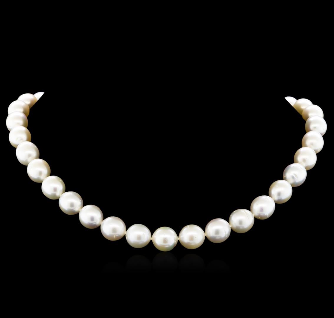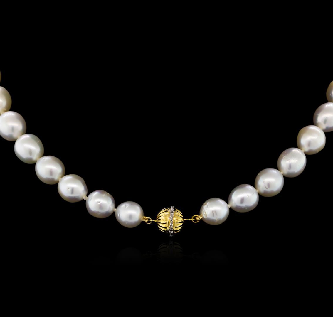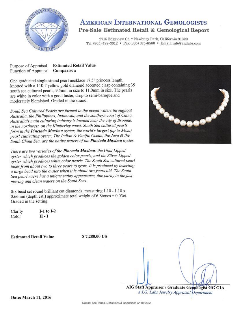 One graduated single strand pearl necklace 17.5" princess length, knotted with a 14KT yellow gold diamond accent clasp containing 35 south sea cultured pearls, 9.5mm in size to 11.0mm in size. The pearls are white in color with a good luster, semi-baroque, moderately blemished Graded in the strand. South Sea Cultured Pearls are farmed in the ocean waters throughout Australia, the Philippines, Indonesia, and the southern coast of China. Australia's main culturing industry is located near the city of Broome, in the northwest, on the Kimberley coast. South Sea cultured pearls form in the Pinctada Maxima oyster, the world's largest (up to 34cm) pearl cultivating oyster. The Indian & Pacific Ocean, the Java & the South China Sea, are the native waters of the Pinctada Maxima oyster. There are two varieties of the Pinctada Maxima: the Gold Lipped oyster which produces the golden color pearls, and the Silver Lipped oyster which produces white color pearls. The South Sea cultured pearl takes from about two to three years to grow. It is produced by inserting a large bead into the oyster when it is about two years old. The South Sea pearl nacre has a unique satiny appearance, due partly to the fast moving and clean waters on the South Seas. Six bead set round brilliant cut diamonds, measuring 1.10 - 1.10 x 0.66mm (depth est.) approximate total weight of 6 Stones = 0.03ct. Graded in the setting. Clarity: I-1 to I-2. Color: H - I. AIG Appraised at $7,280.00.