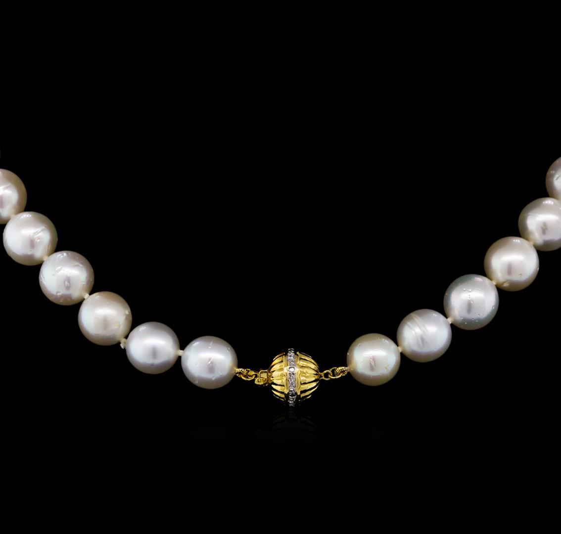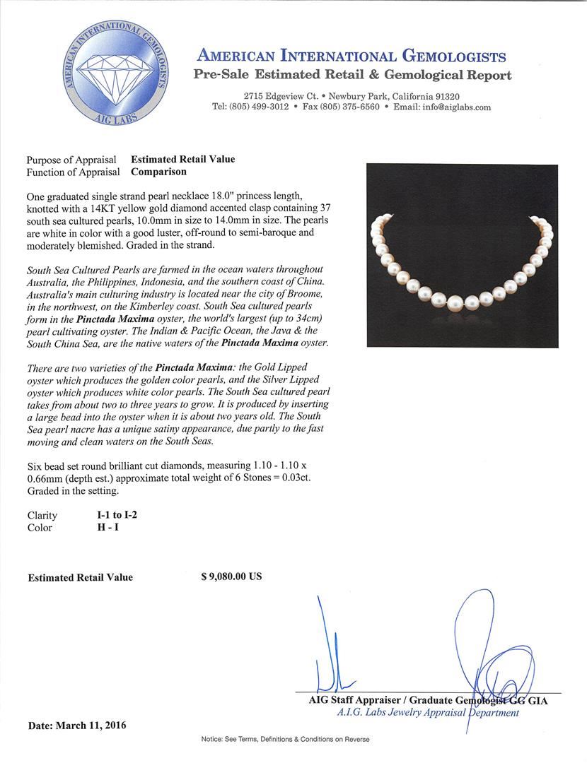 One graduated single strand pearl necklace 18.0" princess length, knotted with a 14KT yellow gold diamond accent clasp containing 37 south sea cultured pearls, 10.0mm in size to 14.0mm in size. The pearls are white in color with a good luster, semi-baroque, moderately blemished Graded in the strand. South Sea Cultured Pearls are farmed in the ocean waters throughout Australia, the Philippines, Indonesia, and the southern coast of China. Australia's main culturing industry is located near the city of Broome, in the northwest, on the Kimberley coast. South Sea cultured pearls form in the Pinctada Maxima oyster, the world's largest (up to 34cm) pearl cultivating oyster. The Indian & Pacific Ocean, the Java & the South China Sea, are the native waters of the Pinctada Maxima oyster. There are two varieties of the Pinctada Maxima: the Gold Lipped oyster which produces the golden color pearls, and the Silver Lipped oyster which produces white color pearls. The South Sea cultured pearl takes from about two to three years to grow. It is produced by inserting a large bead into the oyster when it is about two years old. The South Sea pearl nacre has a unique satiny appearance, due partly to the fast moving and clean waters on the South Seas. Six bead set round brilliant cut diamonds, measuring 1.10 - 1.10 x 0.66mm (depth est.) approximate total weight of 6 Stones = 0.03ct. Graded in the setting. Clarity: I-1 to I-2. Color: H - I. AIG Appraised at $9,080.00.