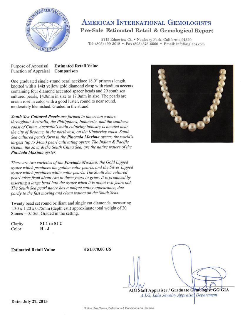 One graduated single strand pearl necklace 18.0" princess length, knotted with a 14kt yellow gold clasp containing 29 south sea cultured pearls, 14.0mm in size to 17.0mm in size. The pearls are cream in color with a good luster, round to near round, moderately blemished Graded in the strand. South Sea Cultured Pearls are farmed in the ocean waters throughout Australia, the Philippines, Indonesia, and the southern coast of China. Australia's main culturing industry is located near the city of Broome, in the northwest, on the Kimberley coast. South Sea cultured pearls form in the Pinctada Maxima oyster, the world's largest (up to 34cm) pearl cultivating oyster. The Indian & Pacific Ocean, the Java & the South China Sea, are the native waters of the Pinctada Maxima oyster. There are two varieties of the Pinctada Maxima: the Gold Lipped oyster which produces the golden color pearls, and the Silver Lipped oyster which produces white color pearls. The South Sea cultured pearl takes from about two to three years to grow. It is produced by inserting a large bead into the oyster when it is about two years old. The South Sea pearl nacre has a unique satiny appearance, due partly to the fast moving and clean waters on the South Seas. Twenty bead set round brilliant and single cut cut diamonds, measuring 1.30 x 1.20 x 0.75mm (depth est.) approximate total weight of 20 Stones = 0.15ct. Graded in the setting. Clarity: SI-1 to SI-2. Color: H - J. AIG Appraised at $51,070.00.