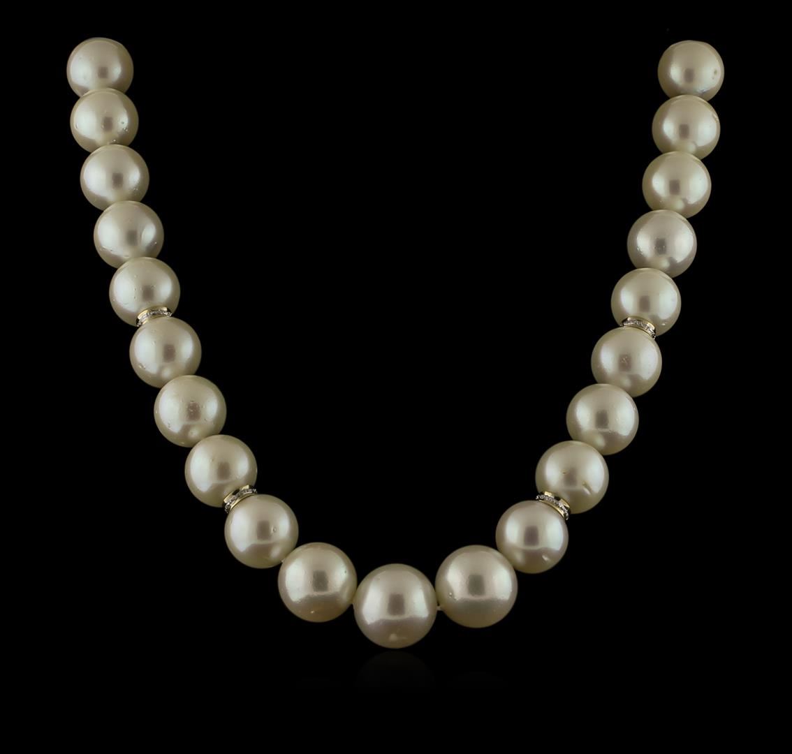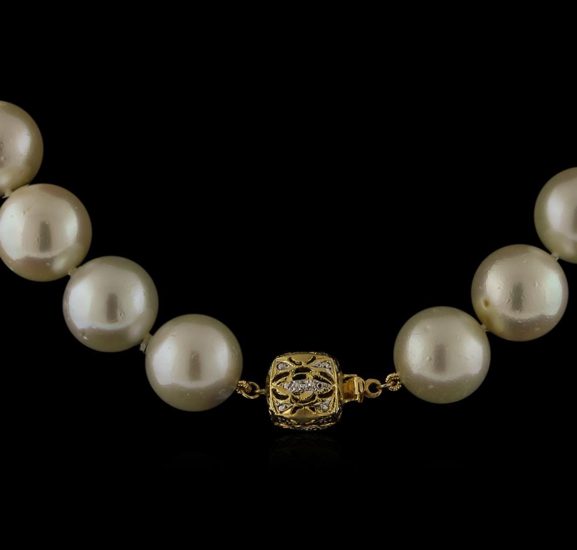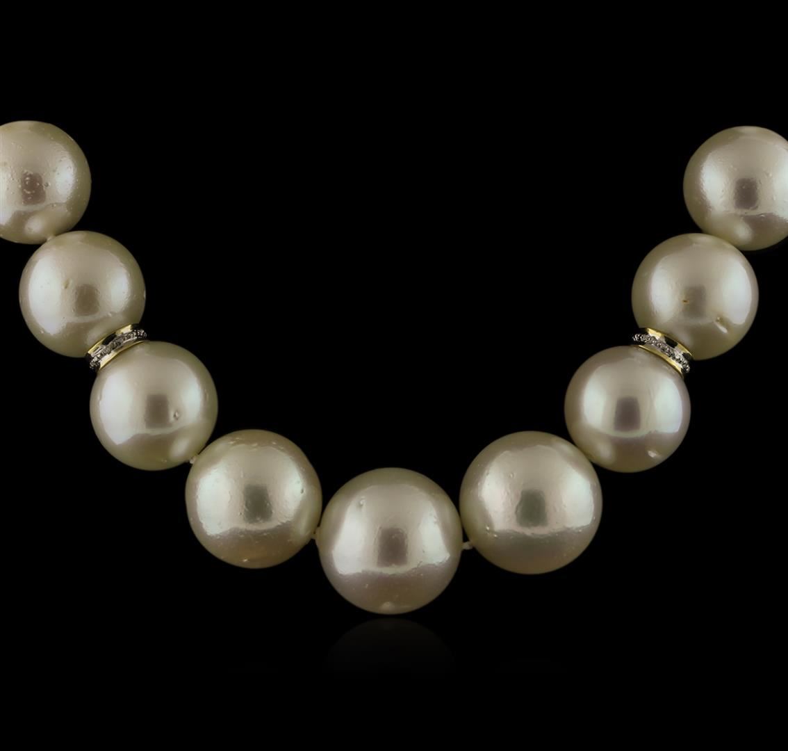 One graduated single strand pearl necklace 18.0" princess length, knotted with a 14kt yellow gold clasp containing 29 south sea cultured pearls, 14.0mm in size to 17.0mm in size. The pearls are cream in color with a good luster, round to near round, moderately blemished Graded in the strand. South Sea Cultured Pearls are farmed in the ocean waters throughout Australia, the Philippines, Indonesia, and the southern coast of China. Australia's main culturing industry is located near the city of Broome, in the northwest, on the Kimberley coast. South Sea cultured pearls form in the Pinctada Maxima oyster, the world's largest (up to 34cm) pearl cultivating oyster. The Indian & Pacific Ocean, the Java & the South China Sea, are the native waters of the Pinctada Maxima oyster. There are two varieties of the Pinctada Maxima: the Gold Lipped oyster which produces the golden color pearls, and the Silver Lipped oyster which produces white color pearls. The South Sea cultured pearl takes from about two to three years to grow. It is produced by inserting a large bead into the oyster when it is about two years old. The South Sea pearl nacre has a unique satiny appearance, due partly to the fast moving and clean waters on the South Seas. Twenty bead set round brilliant and single cut cut diamonds, measuring 1.30 x 1.20 x 0.75mm (depth est.) approximate total weight of 20 Stones = 0.15ct. Graded in the setting. Clarity: SI-1 to SI-2. Color: H - J. AIG Appraised at $51,070.00.