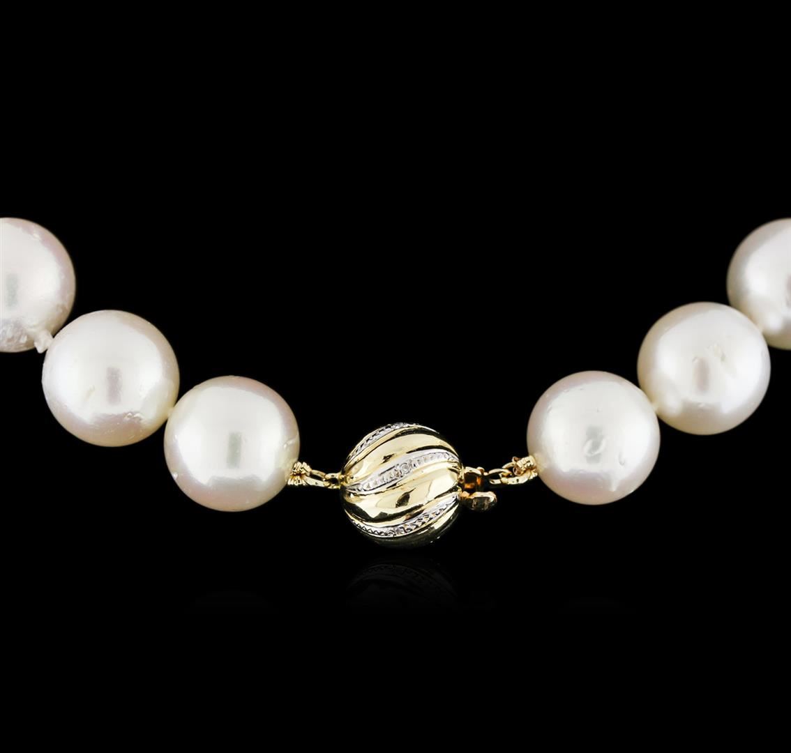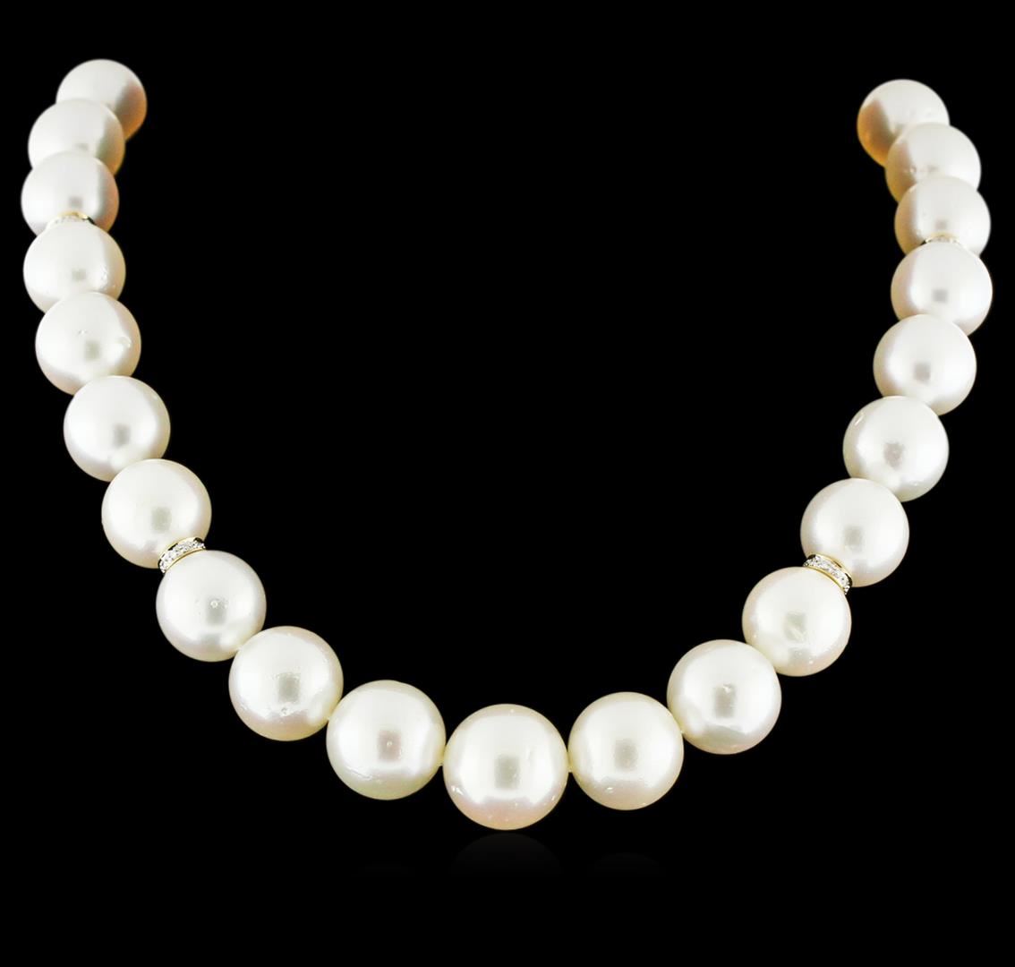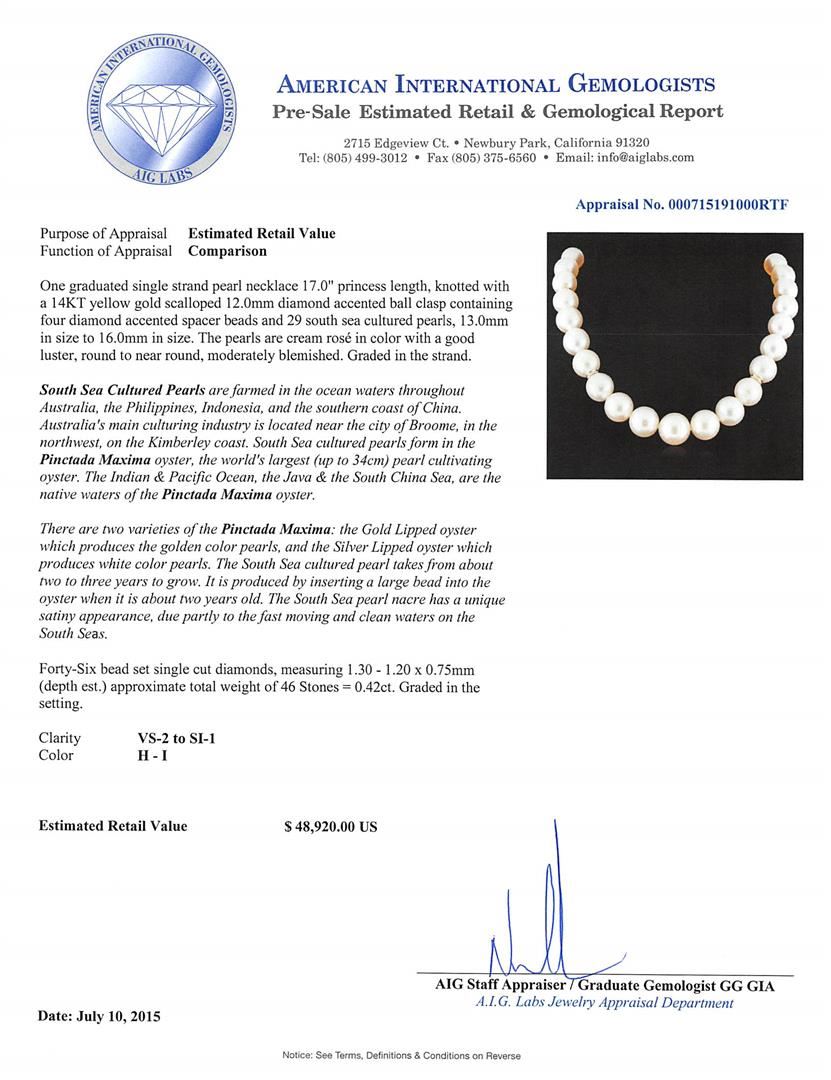 One graduated single strand pearl necklace 17.0" princess length, knotted with a 14KT yellow gold 12.0mm ball c clasp containing 29 south sea cultured pearls, 13.0mm in size to 16.0mm in size. The pearls are cream in color with a good luster, round to near round, moderately blemished Graded in the strand. South Sea Cultured Pearls are farmed in the ocean waters throughout Australia, the Philippines, Indonesia, and the southern coast of China. Australia's main culturing industry is located near the city of Broome, in the northwest, on the Kimberley coast. South Sea cultured pearls form in the Pinctada Maxima oyster, the world's largest (up to 34cm) pearl cultivating oyster. The Indian & Pacific Ocean, the Java & the South China Sea, are the native waters of the Pinctada Maxima oyster. There are two varieties of the Pinctada Maxima: the Gold Lipped oyster which produces the golden color pearls, and the Silver Lipped oyster which produces white color pearls. The South Sea cultured pearl takes from about two to three years to grow. It is produced by inserting a large bead into the oyster when it is about two years old. The South Sea pearl nacre has a unique satiny appearance, due partly to the fast moving and clean waters on the South Seas. Forty-Six bead set single cut diamonds, measuring 1.30 - 1.20 x 0.75mm (depth est.) approximate total weight of 46 Stones = 0.42ct. Graded in the setting. Clarity: VS-2 to SI-1. Color: H - I. AIG Appraised at $48,920.00.