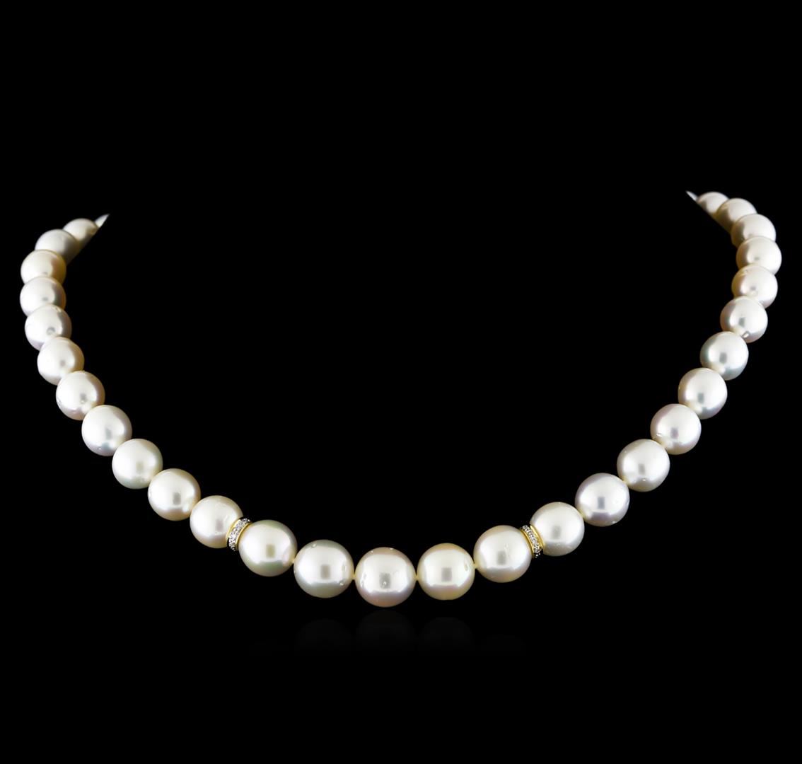 One graduated single strand pearl necklace 17.5" princess length, knotted with a 14KT yellow gold diamond accent clasp containing 41 south sea cultured pearls, 9.0mm in size to 11.5mm in size. The pearls are white in color with a good luster, semi-baroque, moderately blemished Graded in the setting. South Sea Cultured Pearls are farmed in the ocean waters throughout Australia, the Philippines, Indonesia, and the southern coast of China. Australia's main culturing industry is located near the city of Broome, in the northwest, on the Kimberley coast. South Sea cultured pearls form in the Pinctada Maxima oyster, the world's largest (up to 34cm) pearl cultivating oyster. The Indian & Pacific Ocean, the Java & the South China Sea, are the native waters of the Pinctada Maxima oyster. There are two varieties of the Pinctada Maxima: the Gold Lipped oyster which produces the golden color pearls, and the Silver Lipped oyster which produces white color pearls. The South Sea cultured pearl takes from about two to three years to grow. It is produced by inserting a large bead into the oyster when it is about two years old. The South Sea pearl nacre has a unique satiny appearance, due partly to the fast moving and clean waters on the South Seas. Twenty-Eight bead set round brilliant and single cut diamonds, measuring 1.00 x 1.00 x 0.60mm (depth est.) approximate total weight of 28 Stones = 0.14ct. Graded in the setting. Clarity: SI-1 to I-1. Color: G - I. AIG Appraised at $7,945.00.