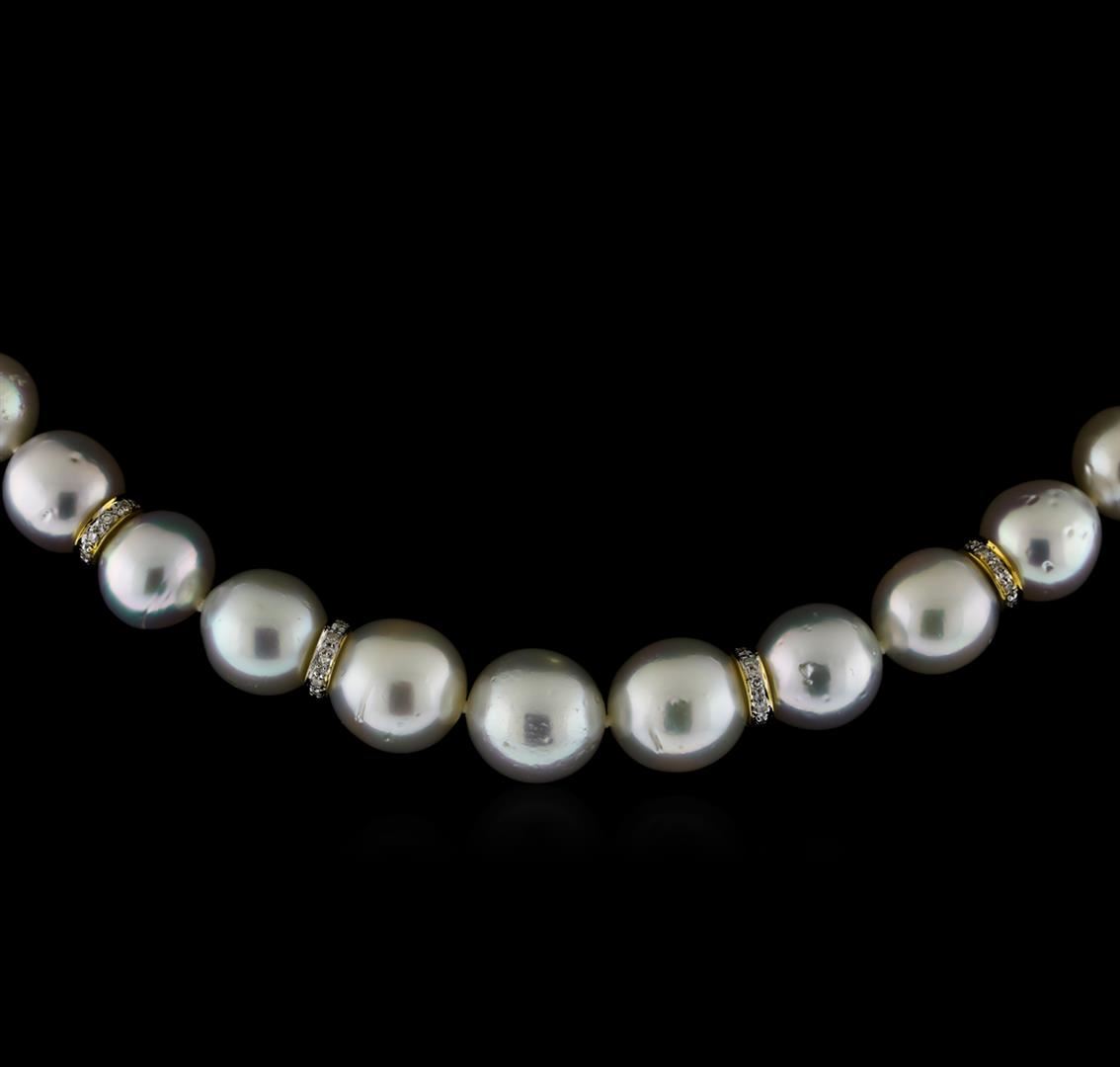 One graduated single strand pearl necklace 17.5" princess length, knotted with a tongue clasp containing 41 south sea cultured pearls, 9.0mm in size to 11.5mm in size. The pearls are light cream in color with a good luster, round to near round, and lightly blemished with very good matching. Graded on the strand. South Sea cultured pearls are farmed in the oceans surrounding Australia, Indonesia, the Philippines and the southern coast of China. The main source of Australian South Sea pearls lies in the northwest on the Kimberly coast. South Sea cultured pearls are formed in the Pinctada Maxima oyster. These pearls take between two to three years to grow and have a unique nacre due to the fast moving and clean waters of the South Seas. Forty prong set single cut diamonds, measuring 1.10 - 1.00 x 0.65mm (depth est.) approximate total weight of 40 Stones = 0.17ct. Graded in the setting. Clarity: SI-1 to SI-2. Color: G - Good Four prong set round brilliant cut diamonds, measuring 1.20 - 1.10 x 0.69mm (depth est.) approximate total weight of 4 Stones = 0.02ct. Graded in the setting. Clarity: VS-2 to SI-1. Color: H - I. Cut Very Good. Total Weight of Diamonds 0.19ct. Total Weight of 61.10gm GAS Appraised at $22,780.00.
