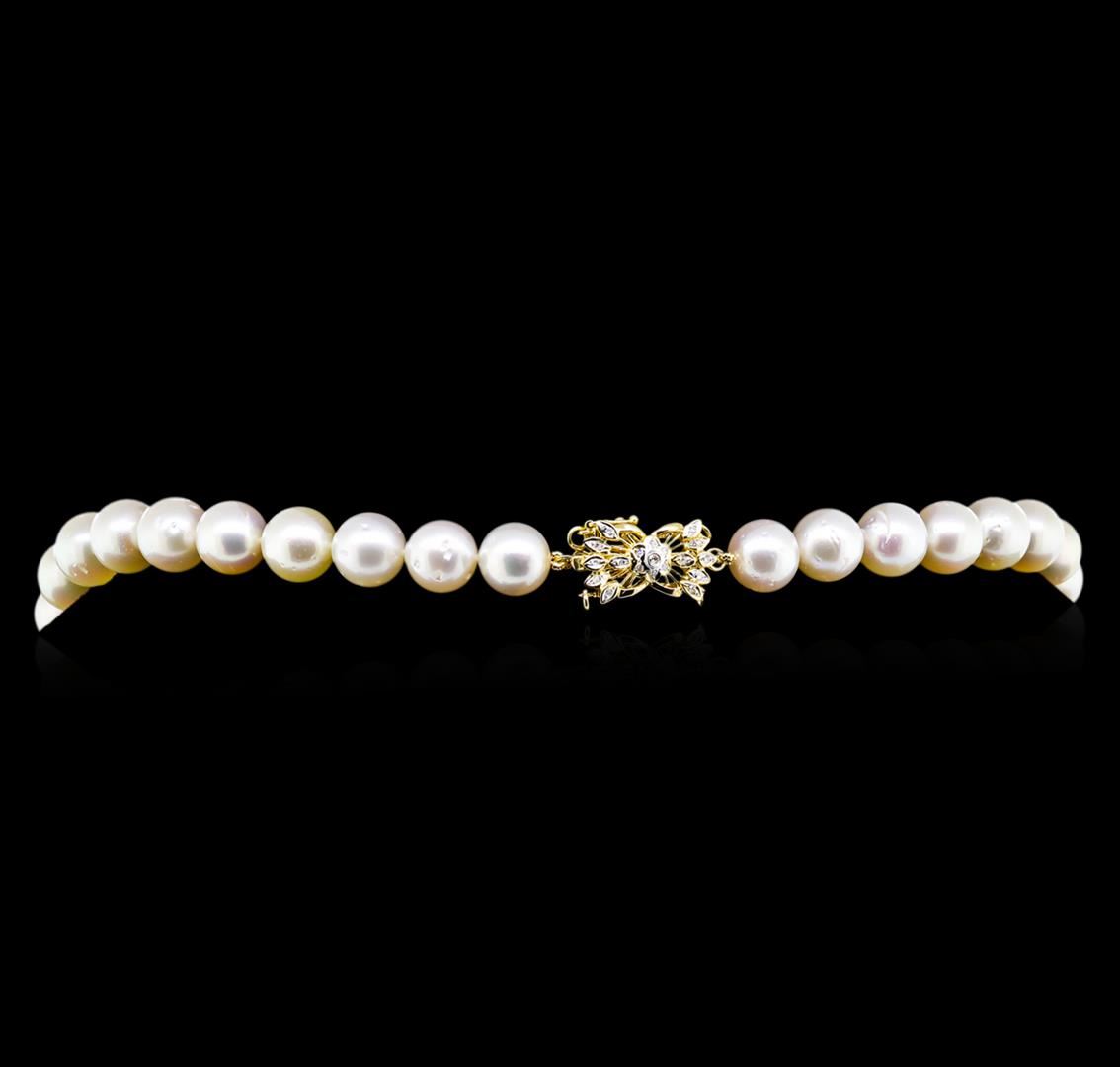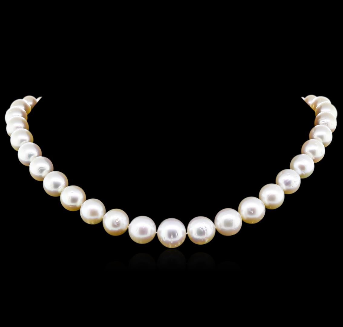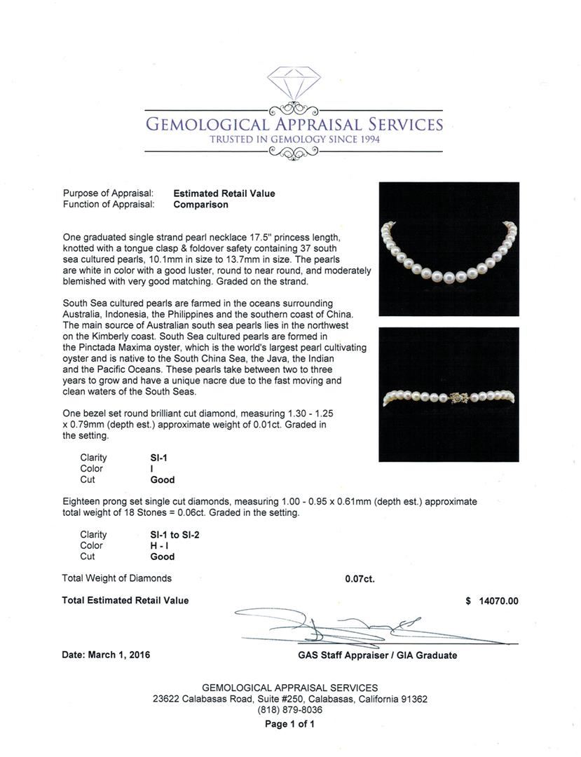 One graduated single strand pearl necklace 17.5" princess length, knotted with a tongue clasp & foldover safety containing 37 south sea cultured pearls, 10.1mm in size to 13.7mm in size. The pearls are white in color with a good luster, round to near round, and moderately blemished with very good matching. Graded on the strand. South Sea cultured pearls are farmed in the oceans surrounding Australia, Indonesia, the Philippines and the southern coast of China. The main source of Australian south sea pearls lies in the northwest on the Kimberly coast. South Sea cultured pearls are formed in the Pinctada Maxima oyster, which is the world's largest pearl cultivating oyster and is native to the South China Sea, the Java, the Indian and the Pacific Oceans. These pearls take between two to three years to grow and have a unique nacre due to the fast moving and clean waters of the South Seas. One bezel set round brilliant cut diamond, measuring 1.30 - 1.25 x 0.79mm (depth est.) approximate weight of 0.01ct. Graded in the setting. Clarity: SI-1. Color: I. Cut Good Eighteen prong set single cut diamonds, measuring 1.00 - 0.95 x 0.61mm (depth est.) approximate. Total Weight of 18 Stones = 0.06ct. Graded in the setting. Clarity: SI-1 to SI-2. Color: H - I. Cut Good. Total Weight of Diamonds 0.07ct. GAS Appraised at $14,070.00.