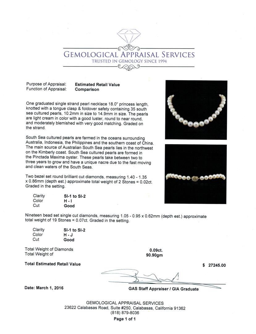 One graduated single strand pearl necklace 18.0" princess length, knotted with a tongue clasp & foldover safety containing 35 south sea cultured pearls, 10.2mm in size to 14.9mm in size. The pearls are light cream in color with a good luster, round to near round, and moderately blemished with very good matching. Graded on the strand. South Sea cultured pearls are farmed in the oceans surrounding Australia, Indonesia, the Philippines and the southern coast of China. The main source of Australian South Sea pearls lies in the northwest on the Kimberly coast. South Sea cultured pearls are formed in the Pinctada Maxima oyster. These pearls take between two to three years to grow and have a unique nacre due to the fast moving and clean waters of the South Seas. Two bezel set round brilliant cut diamonds, measuring 1.40 - 1.35 x 0.86mm (depth est.) approximate. Total Weight of 2 Stones = 0.02ct. Graded in the setting. Clarity: SI-1 to SI-2. Color: H - I. Cut Good Nineteen bead set single cut diamonds, measuring 1.05 - 0.95 x 0.62mm (depth est.) approximate. Total Weight of 19 Stones = 0.07ct. Graded in the setting. Clarity: SI-1 to SI-2. Color: H - J. Cut Good. Total Weight of Diamonds 0.09ct. Total Weight of 90.90gm. GAS Appraised at $27,245.00.
