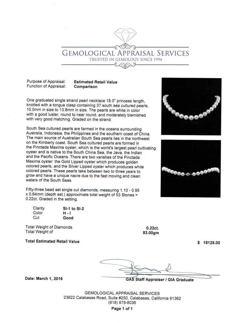 One graduated single strand pearl necklace 18.0" princess length, knotted with a tongue clasp containing 37 south sea cultured pearls, 10.0mm in size to 13.8mm in size. The pearls are white in color with a good luster, round to near round, and moderately blemished with very good matching. Graded on the strand. South Sea cultured pearls are farmed in the oceans surrounding Australia, Indonesia, the Philippines and the southern coast of China. The main source of Australian South Sea pearls lies in the northwest on the Kimberly coast. South Sea cultured pearls are formed in the Pinctada Maxima oyster, which is the world's largest pearl cultivating oyster and is native to the South China Sea, the Java, the Indian and the Pacific Oceans. There are two varieties of the Pinctada Maxima oyster: the Gold Lipped oyster which produces golden colored pearls, and the Silver Lipped oyster which produces white colored pearls. These pearls take between two to three years to grow and have a unique nacre due to the fast moving and clean waters of the South Seas. Fifty-Three bead set single cut diamonds, measuring 1.10 - 0.95 x 0.64mm (depth est.) approximate. Total Weight of 53 Stones = 0.22ct. Graded in the setting. Clarity: SI-1 to SI-2. Color: H - I. Cut Good. Total Weight of Diamonds 0.22ct. Total Weight of 83.00gm. GAS Appraised at $18,125.00.
