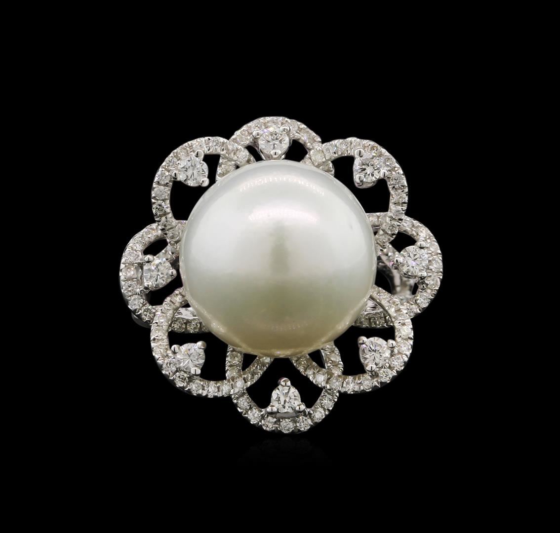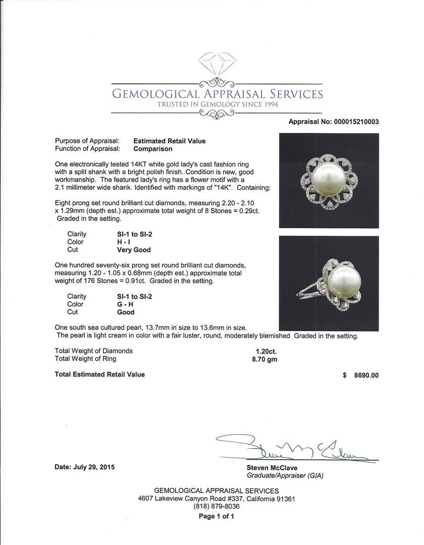 One electronically tested 14KT white gold lady's cast fashion ring with a split shank with a bright polish finish. The featured lady's ring has a flower motif with a 2.1 millimeter wide shank. Identified with markings of "14K". Condition is new, good workmanship. Containing: Eight prong set round brilliant cut diamonds, measuring 2.20 - 2.10 x 1.29mm (depth est.) approximate. Total Weight of 8 Stones = 0.29ct. Graded in the setting. Clarity: SI-1 to SI-2. Color: H - I. Cut Very Good One Hundred Seventy-Six prong set round brilliant cut diamonds, measuring 1.20 - 1.05 x 0.68mm (depth est.) approximate. Total Weight of 176 Stones = 0.91ct. Graded in the setting. Clarity: SI-1 to SI-2. Color: G - Good One south sea cultured pearl, 13.7mm in size to 13.6mm in size. The pearl is light cream in color with a fair luster, round, and moderately blemished. Graded in the setting. Total Weight of Diamonds 1.20ct. Total Weight of Ring 8.70gm. GAS Appraised at $8,690.00.