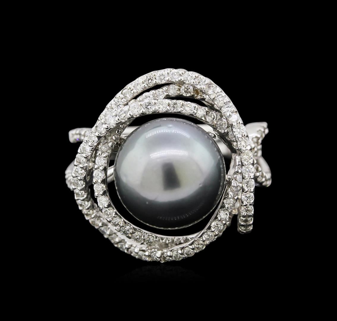 One electronically tested 14KT white gold lady's cast fashion ring with a split shank with a bright polish finish. The featured lady's ring has a shank measuring 3.35 millimeters wide. Identified with markings of "K14". Condition is new, good workmanship. Containing: One south sea cultured pearl, 12.1mm in size to 12.0mm in size. The pearl is grey in color, green overtone with a good luster, round, and lightly blemished. Graded in the setting. One Hundred Thirty-Two prong set round brilliant cut diamonds, measuring 1.40 - 1.30 x 0.81mm (depth est.) approximate total weight of 132 Stones = 1.20ct. Graded in the setting. Clarity: SI-2 to I-1. Color: H - I. Cut Good. Total Weight of Diamonds 1.20ct. Total Weight of Ring 10.60gm. GAS Appraised at $6,460.00.