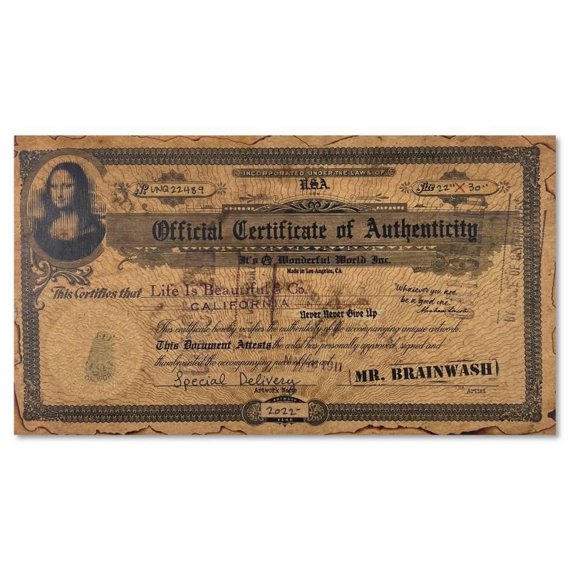"Special Delivery" is a unique (UNIQ) mixed media on deckle edge paper by Mr. Brainwash, hand signed inverso and bearing the thumbprint of the artist. This piece comes custom framed. Includes Certificate of Authenticity. Measures approx. 34" x 26" (frame), 30" x 22" (image).