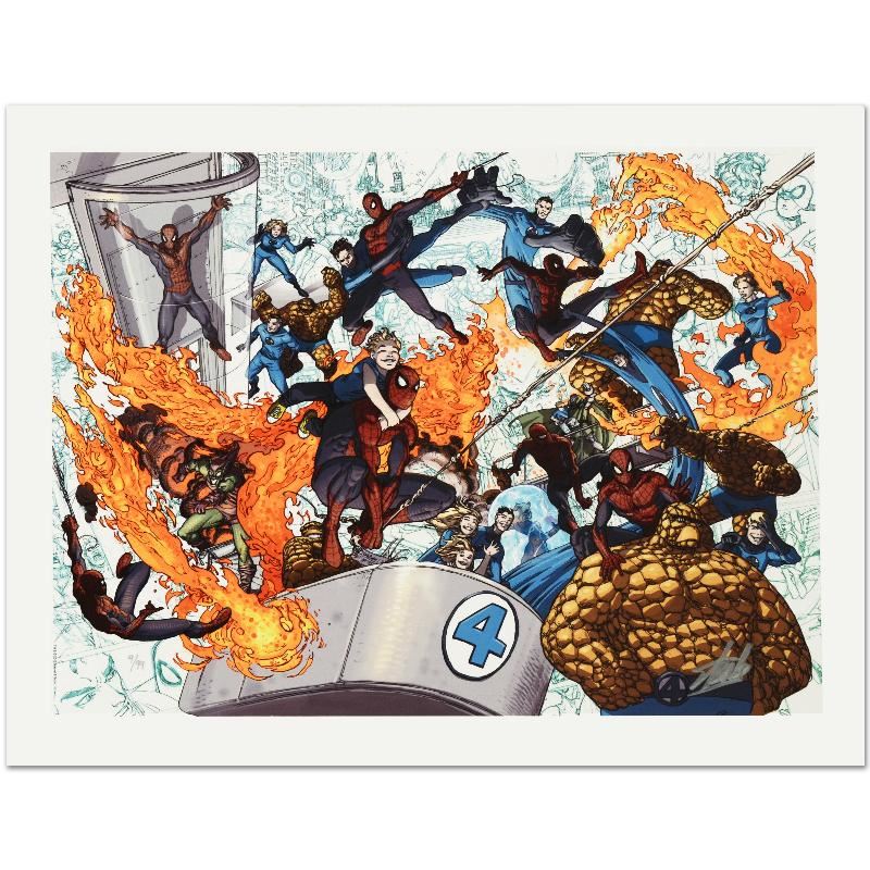 A piece of comic book history, this limited edition, from original art by Mario Alberti, depicts an action-packed scene with Spider-Man and the Fantastic Four. Italian artist Mario Alberti is particularly known for his covered work for both DC and Marvel comics. "Iron Age: Alpha #1" is a limited edition giclee on canvas by Mario Alberti presented by Marvel Comics, numbered and hand signed by the great Stan Lee! Includes Certificate of Authenticity! Measures approx. 24" x 18" (image).