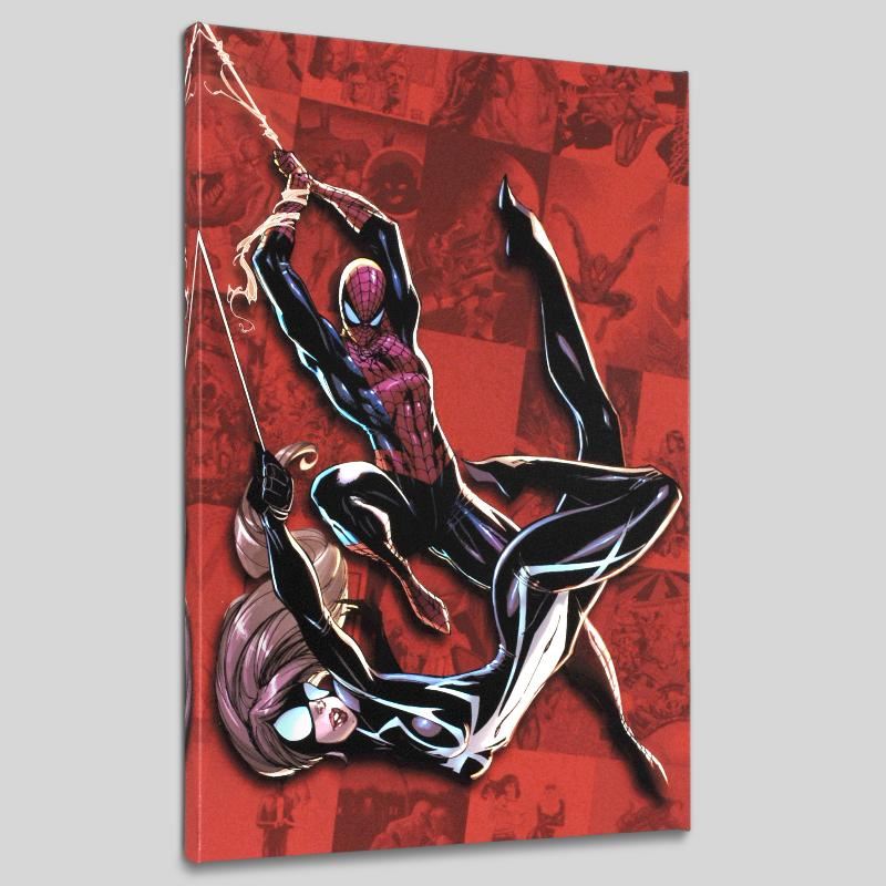 A piece of comic book history, this limited edition, from original art by J. Scott Campbell, depicts famous characters from the classic Spider-Man series. Though he became famous for drawing for Wildstorm Comics, J. Scott Campbell now works on a Spider-Man series with Jeff Loeb. "Spider-Man Saga" is a limited edition numbered giclee on canvas by J. Scott Campbell presented by Marvel Comics. This piece comes gallery wrapped and ready to hang. Includes Certificate of Authenticity! Measures approx. 18" x 27" (image).