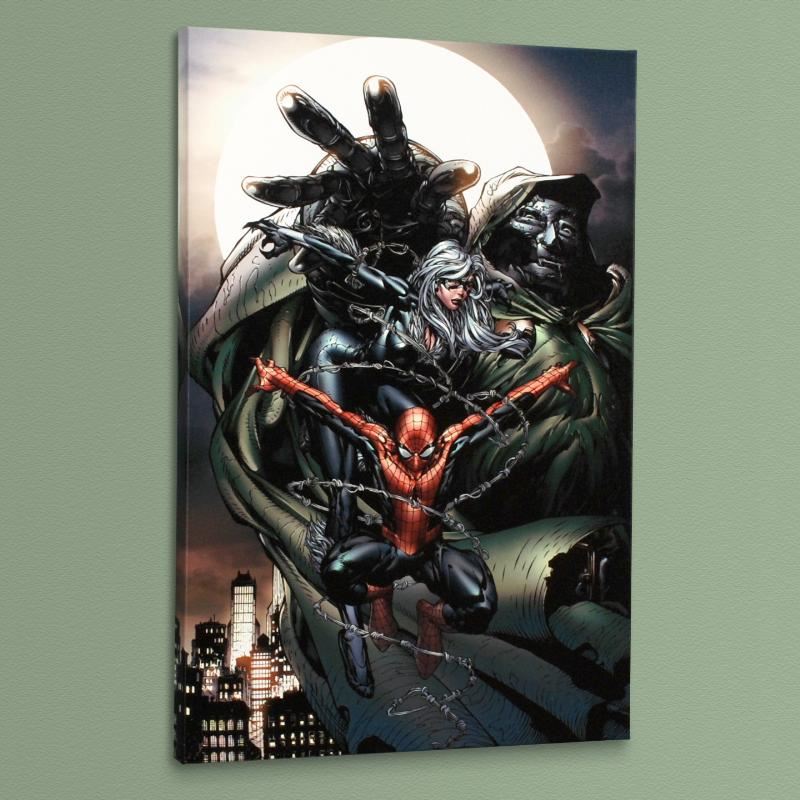 A piece of comic book history, this limited edition, from original art by David Finch, depicts Black Cat, Dr. Doom, and Spider-Man. In 2003, Finch came to Marvel Comics for a year-long arc on Ultimate X-Men, after which he began work on The Avengers and thereafter The New Avengers. He has also worked on such titles as Captain America, Spider-Man and the Hulk. "Spider-Man Unlimited #14" is a limited edition numbered giclee on canvas by David Finch presented by Marvel Comics. This piece comes gallery wrapped. Includes Certificate of Authenticity! Measures approx. 18" x 27" (image); 1.5" (depth).