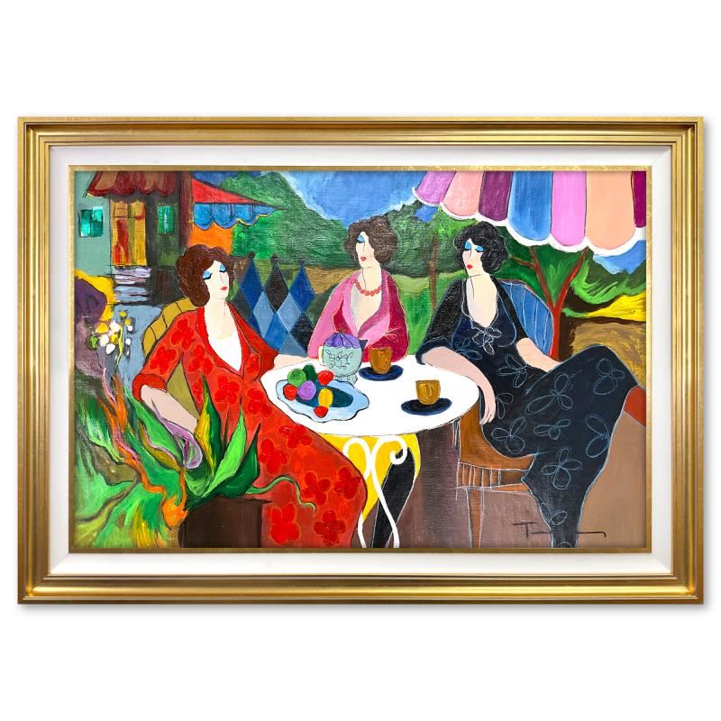 "Spring Afternoon" is a one-of-a-kind mixed media over paint by Itzchak Tarkay (1935-2012), hand signed by the artist. This piece comes custom framed. Includes Certificate of Authenticity. Measures approx. 32" x 44" (frame), 24" x 36" (image).