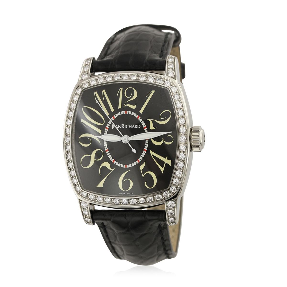 One ladies Stainless Steel Jean Richard TV Screen Swiss Wristwatch. This watch features 28mm Stainless Steel Case, Diamond Bezel, Black Dial with Arabic Numerals, Automatic Mechanical Movement, Analog Display, weighing a total of 71.7 grams.
