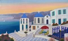 A charming Grecian island setting for Fanch Ledan's 13x21.75" stretched acrylic on canvas; by COA