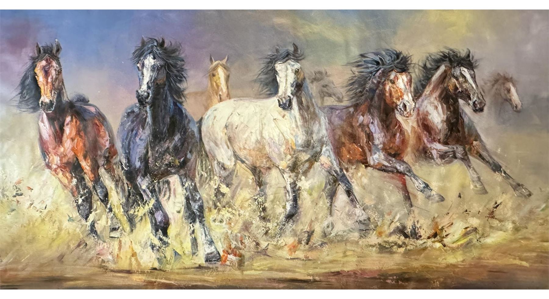 A small group of horses run through a stream by Inam. - Oil on Canvas 40x80 w/COA