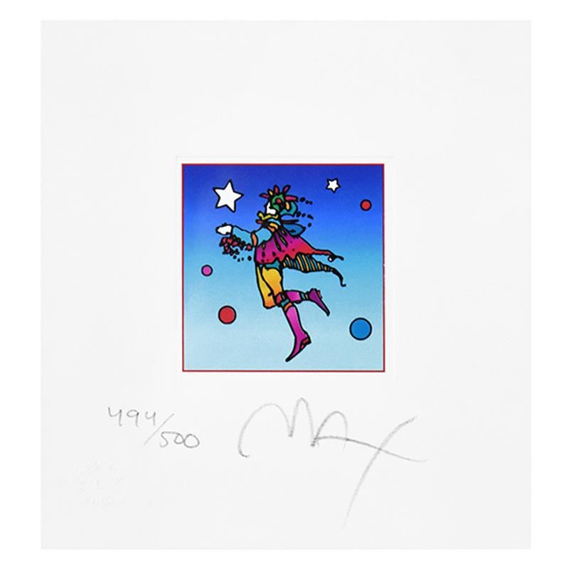 "Star Catcher on Blue" is a limited edition lithograph on paper by Peter Max, numbered 494/500 and hand signed by the artist. This piece comes framed and includes Certificate of Authenticity from Peter Max Studios. Measures approximately 20.5" x 19.5 (frame), 5" x 4.5" (image).