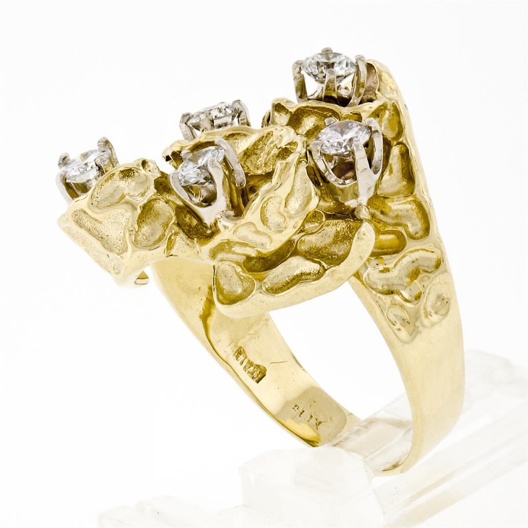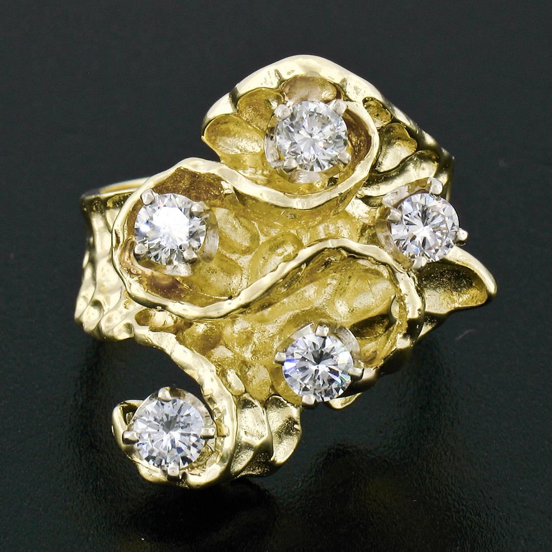 A vintage solid 18k yellow gold cocktail ring, with 5 round brilliant cut natural diamonds (G/H - VS1/VS2 ; 1.03ctw). The ring is size 7.5, weighs a total of 13.76 grams, and measures 23.0mm wide.