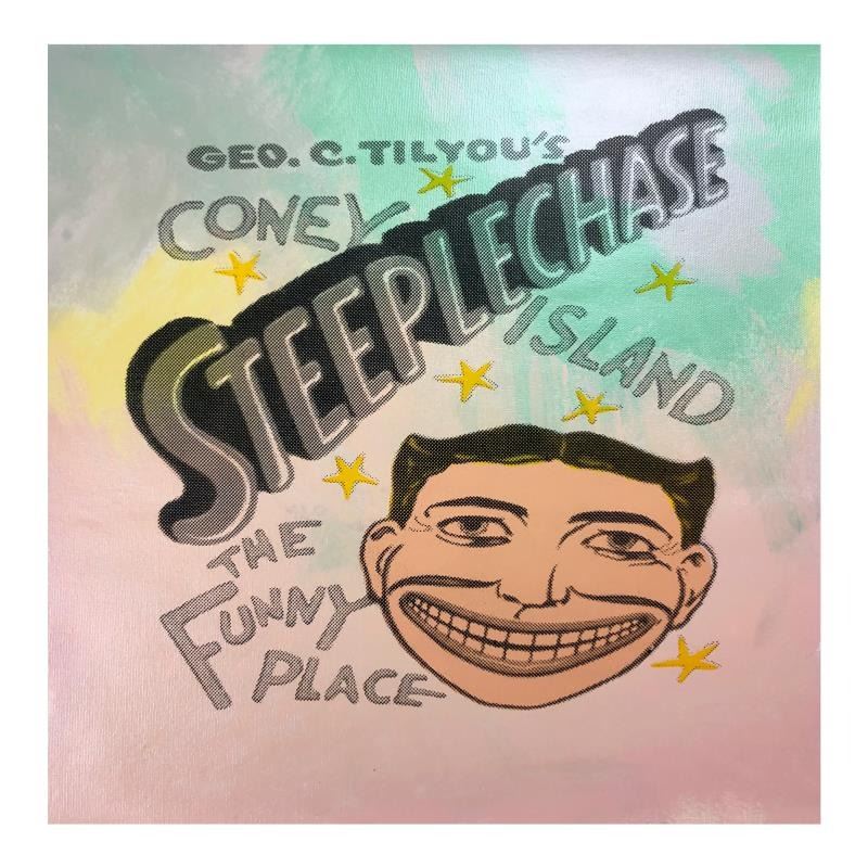 "Steepechase, Coney Island" is limited edition hand pulled silkscreen unique mixed media on canvas by Andy Warhol protege Steve Kaufman (1960-2010). This piece is numbered and hand signed inverso and includes a letter of authenticity. As is common with Kaufman's works, this piece may have perceived minor flaws, but is in overall good condition. Measures approximately 16.5" x 17" before cropping.