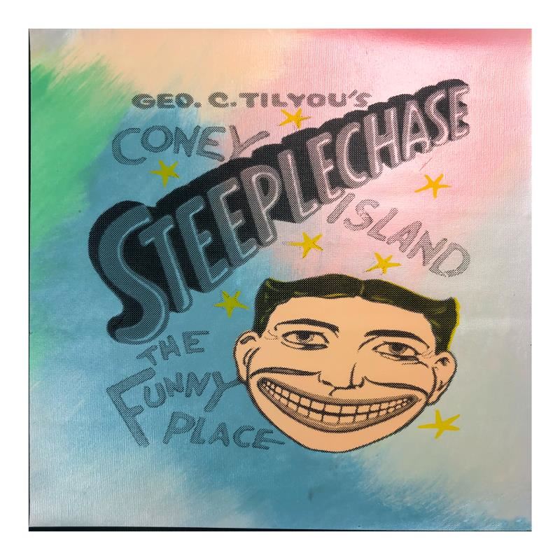 "Steepechase, Coney Island" is limited edition hand pulled silkscreen unique mixed media on canvas by Andy Warhol protege Steve Kaufman (1960-2010). This piece is numbered and hand signed inverso and includes a letter of authenticity. As is common with Kaufman's works, this piece may have perceived minor flaws, but is in overall good condition. Measures approximately 16.5" x 17" before cropping.