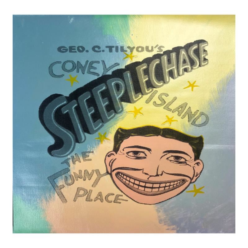 "Steepechase, Coney Island" is limited edition hand pulled silkscreen unique mixed media on canvas by Andy Warhol protege Steve Kaufman (1960-2010). This piece is numbered and hand signed inverso and includes a letter of authenticity. As is common with Kaufman's works, this piece may have perceived minor flaws, but is in overall good condition. Measures approximately 16.5" x 17" before cropping.