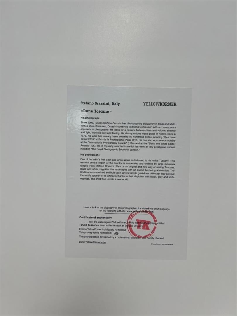 Stefano Orazzini Italy Dune Toscane YellowKorner Certified Photograph. Certificate of Authenticity from YellowKorner affixed to the back. Matted Dimensions 16"x20". Protected with Clear Mylar Sleeve.