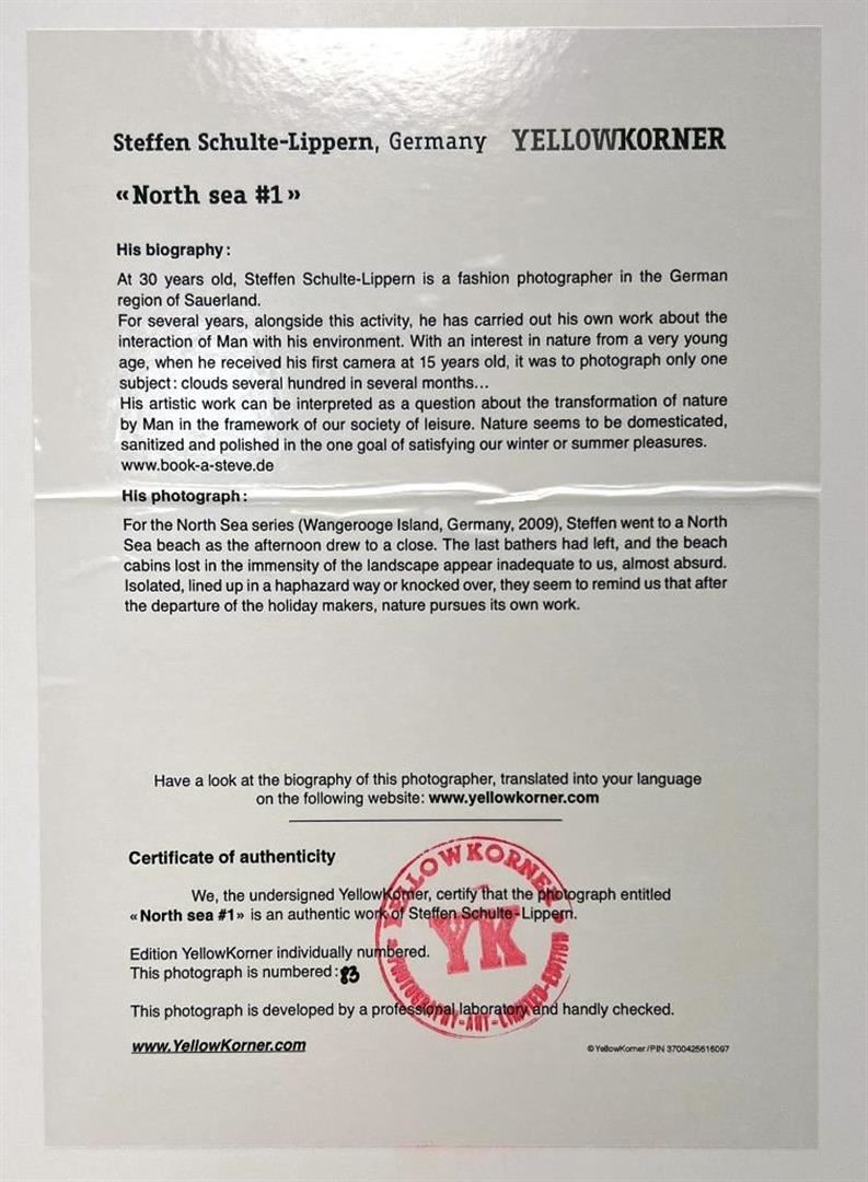 Steffen Schulte Lippern Germany North Sea #1 YellowKorner Certified Photograph. Certificate of Authenticity from YellowKorner affixed to the back. Matted Dimensions 16"x20". Protected with Clear Mylar Sleeve.