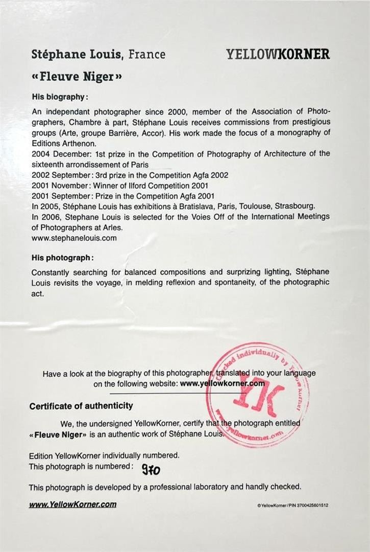 Stephane Louis France Fleuve Niger YellowKorner Certified Photograph. Certificate of Authenticity from YellowKorner affixed to the back. Matted Dimensions 16"x20". Protected with Clear Mylar Sleeve.