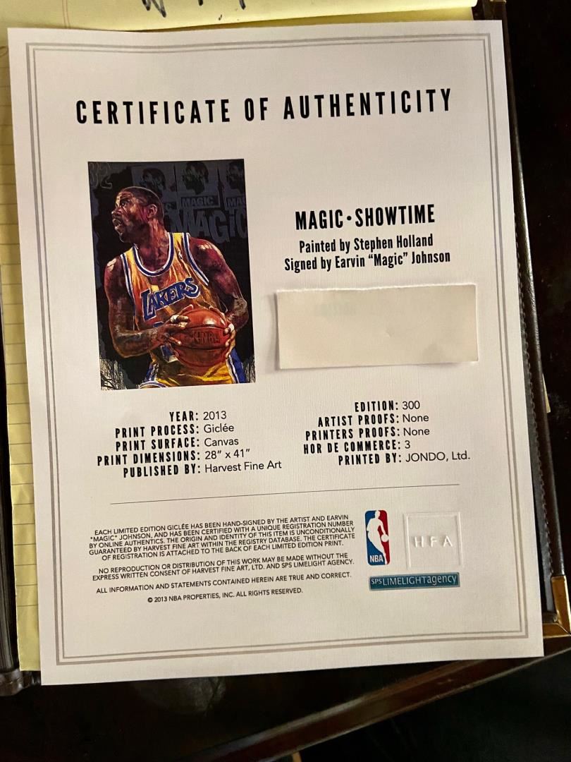A stretched giclee on canvas , handsigned by the Magic Johnson & by artist Stephen Holland 29.5x42.5" w/ Certificate. Framed .