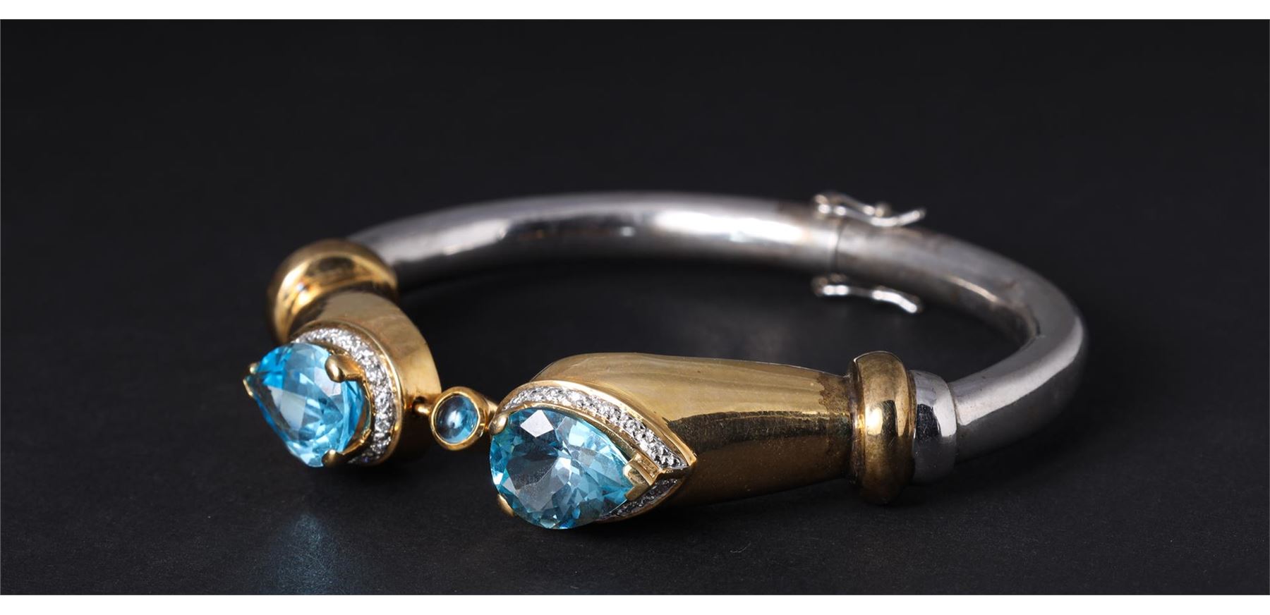 Sterling Silver, 14K Yellow Gold & Blue Topaz Split Bracelet containing three blue topaz weighing approximately 8.0 cts. Thirty round brilliant cut diamonds weighing approximately 0.25 cts. Total weight of 43.1 gm. Estimated retail value $4,800.