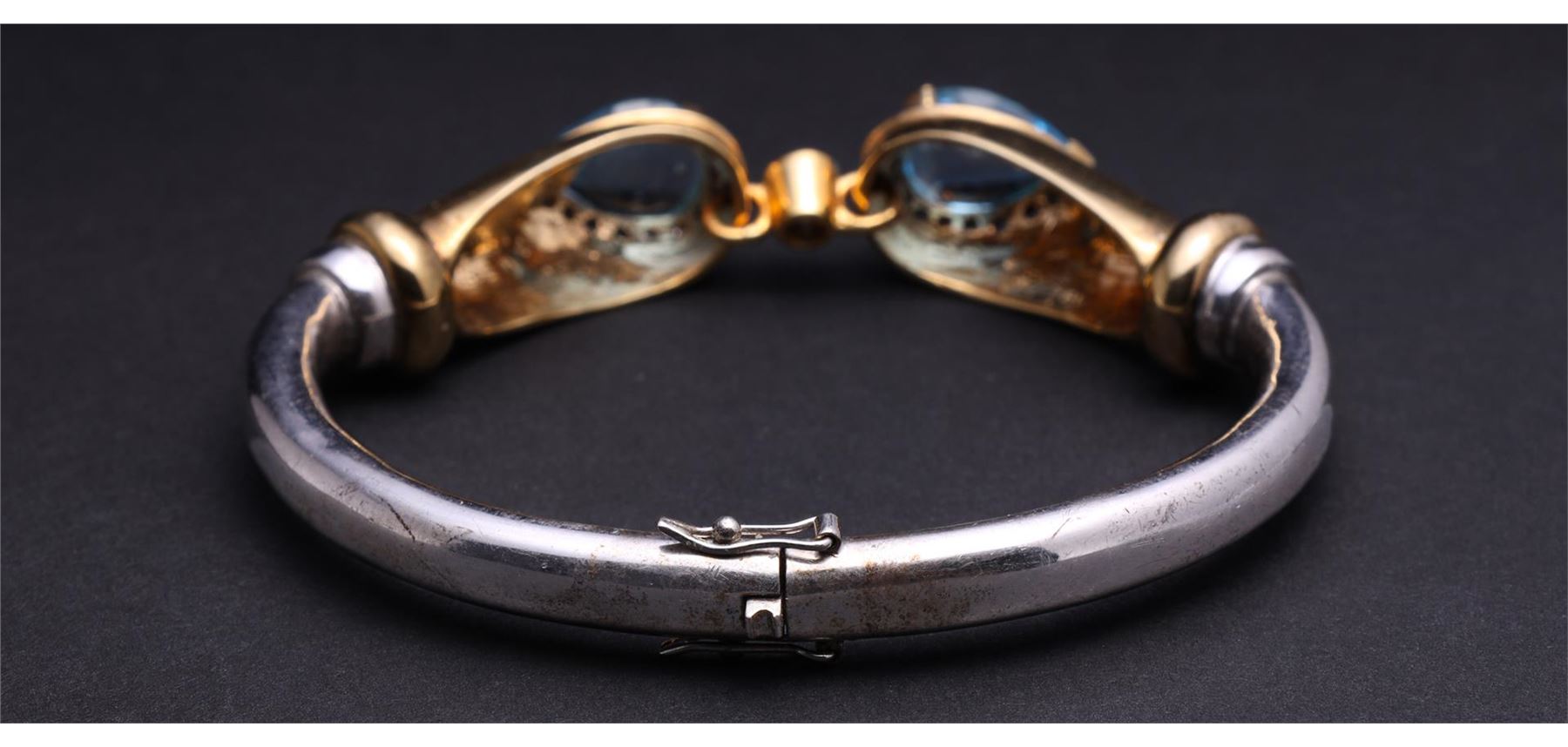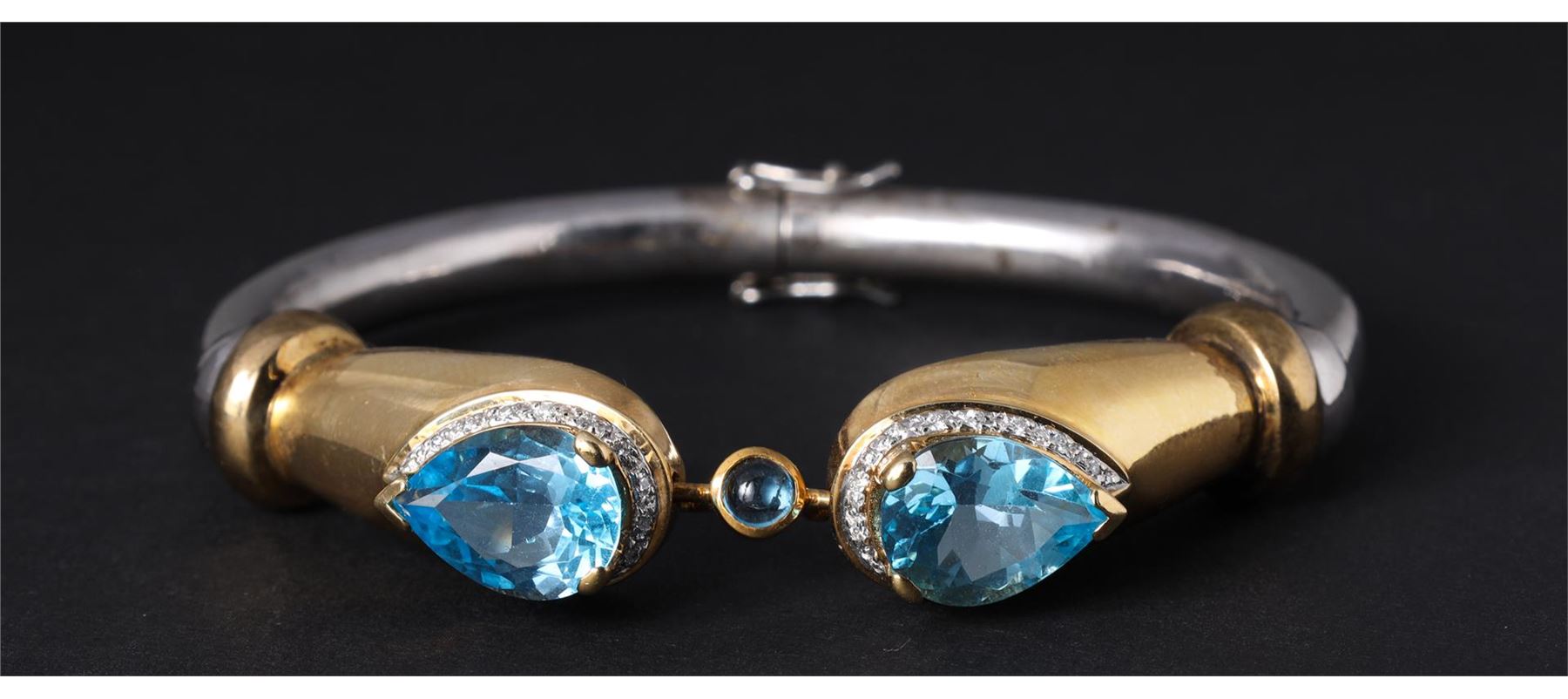 Sterling Silver, 14K Yellow Gold & Blue Topaz Split Bracelet containing three blue topaz weighing approximately 8.0 cts. Thirty round brilliant cut diamonds weighing approximately 0.25 cts. Total weight of 43.1 gm. Estimated retail value $4,800.