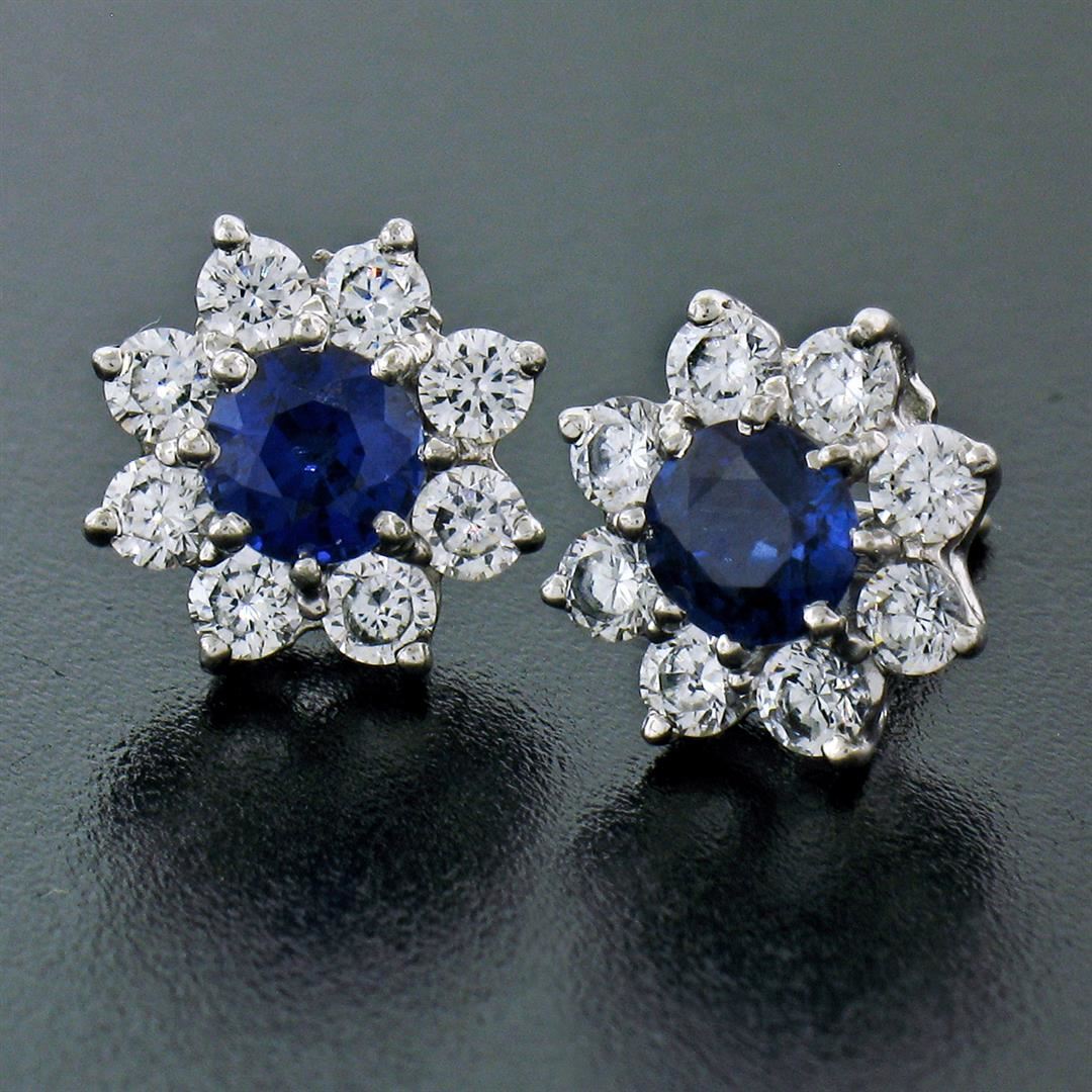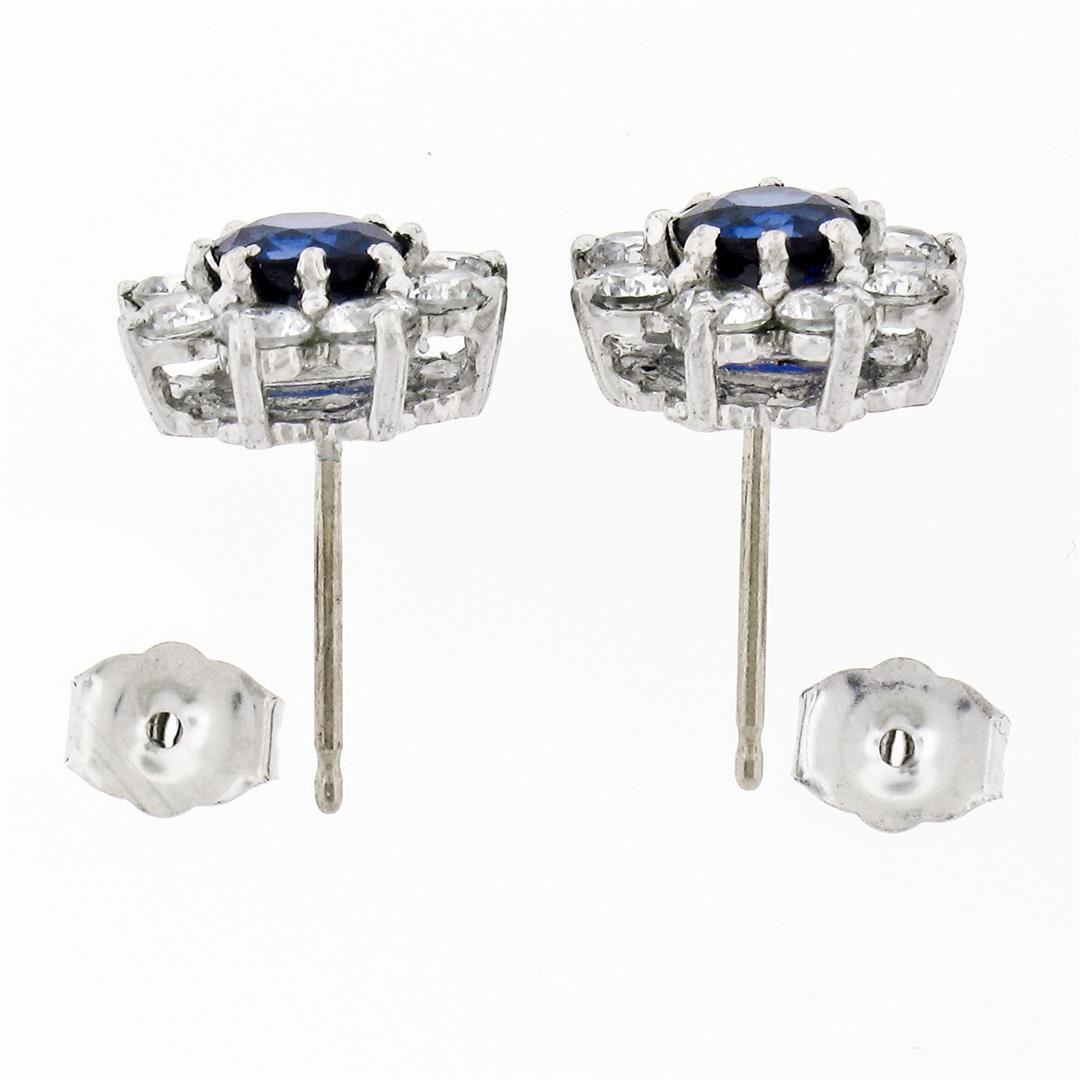 A pair of sterling silver earrings with 14k white gold posts featuring a pair of round blue crystals (4.9mm) surrounded by round cut cubic zirconias (2.5mm). The earrings measure approximately 10.75mm in diameter and weigh a total of 2.38 grams.