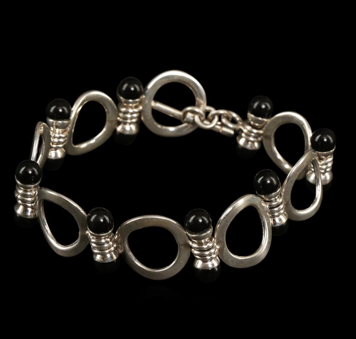 One of a kind high fashion sterling silver Bracelet weighing 33 grams. Containing: Black Resin Beads. This sterling silver promises a lasting shine.