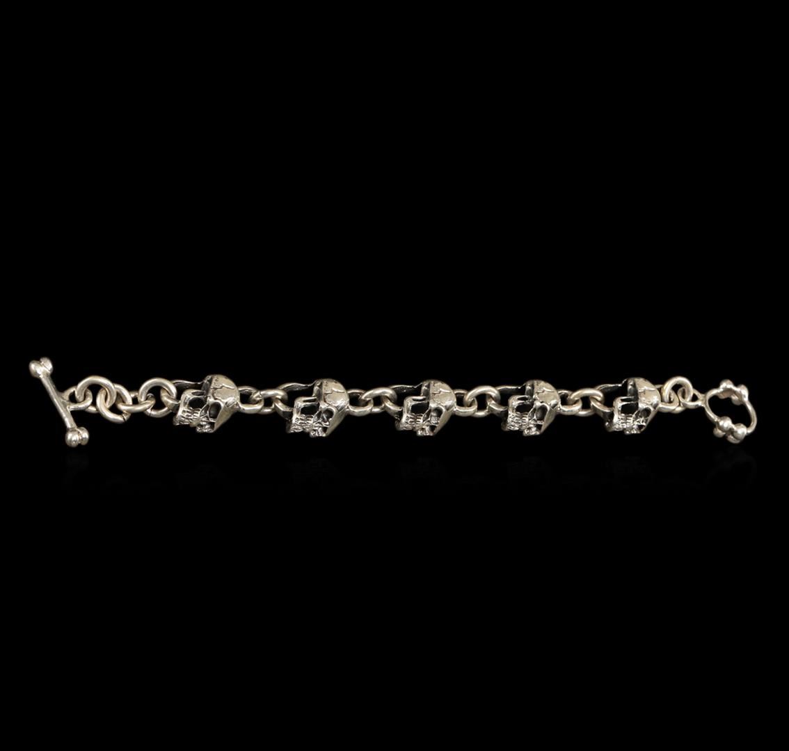 One of a kind high fashion sterling silver Bracelet weighing 73.6 grams. Black Antique texture on skulls. This sterling silver promises a lasting shine.