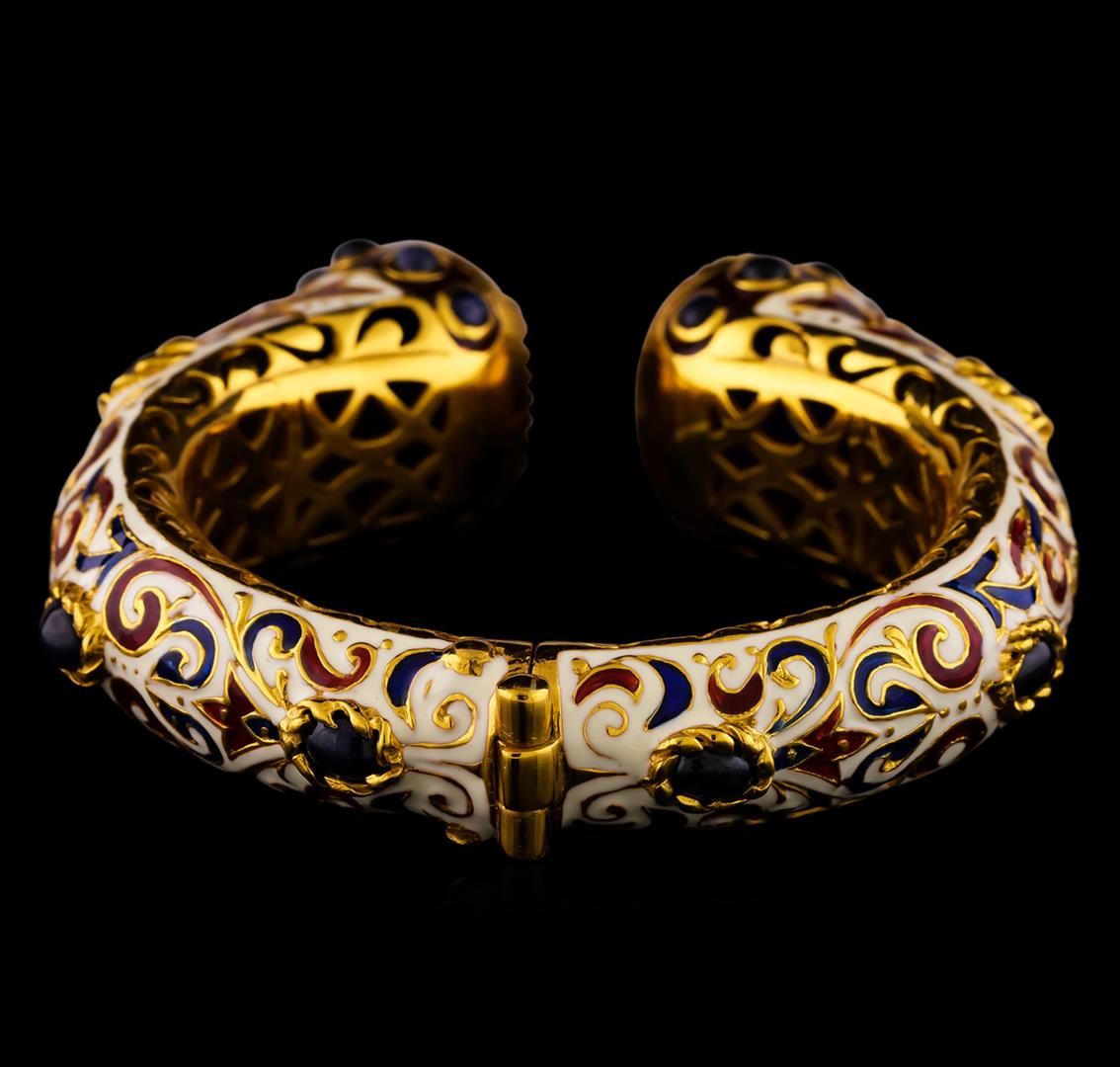 One of a kind high fashion sterling silver Bracelet weighing 101.8 grams. Containing: Sapphire, Multi-color Enamel Inlay. This sterling silver promises a lasting shine.