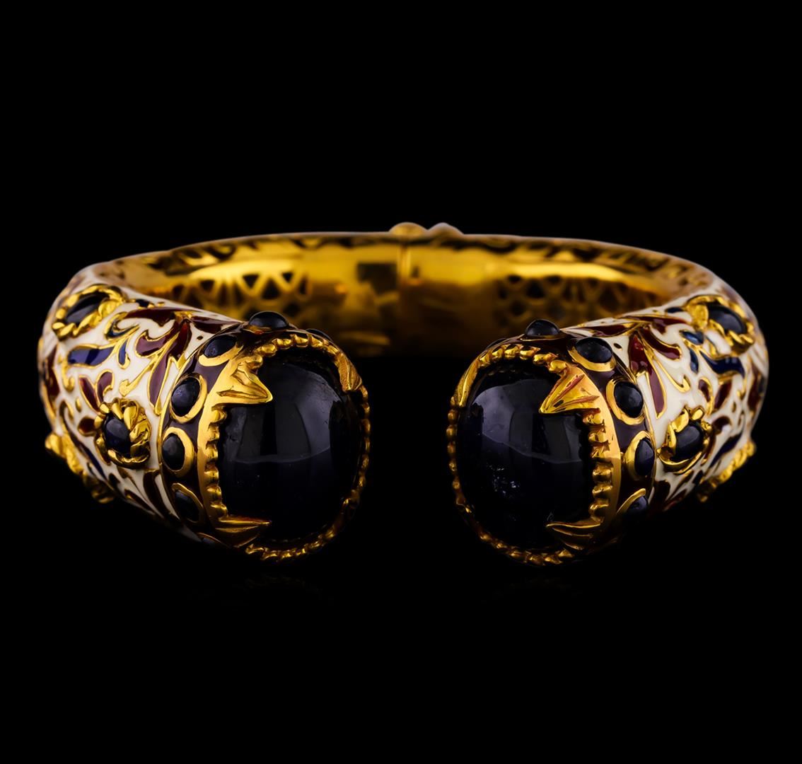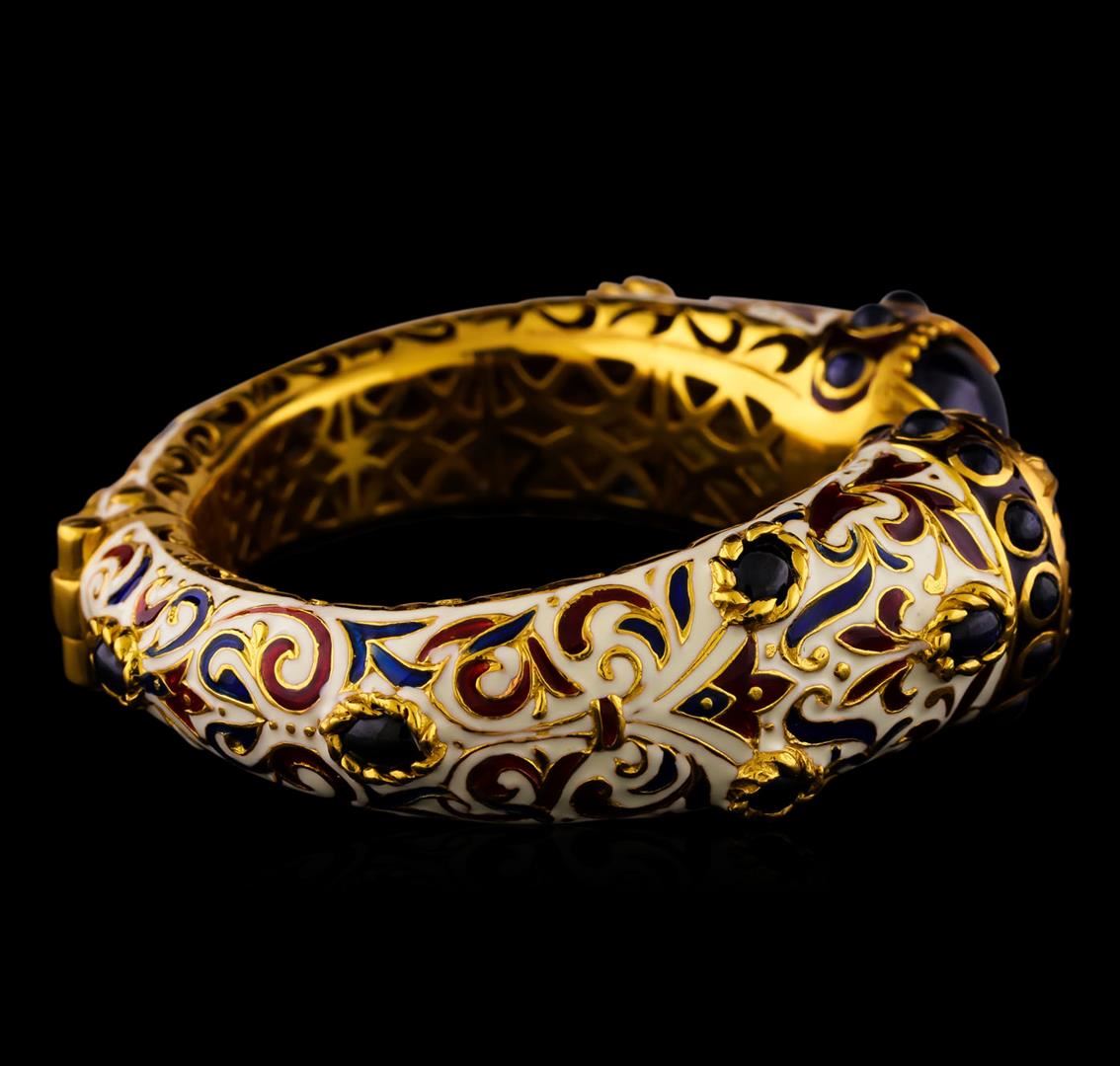 One of a kind high fashion sterling silver Bracelet weighing 101.8 grams. Containing: Sapphire, Multi-color Enamel Inlay. This sterling silver promises a lasting shine.