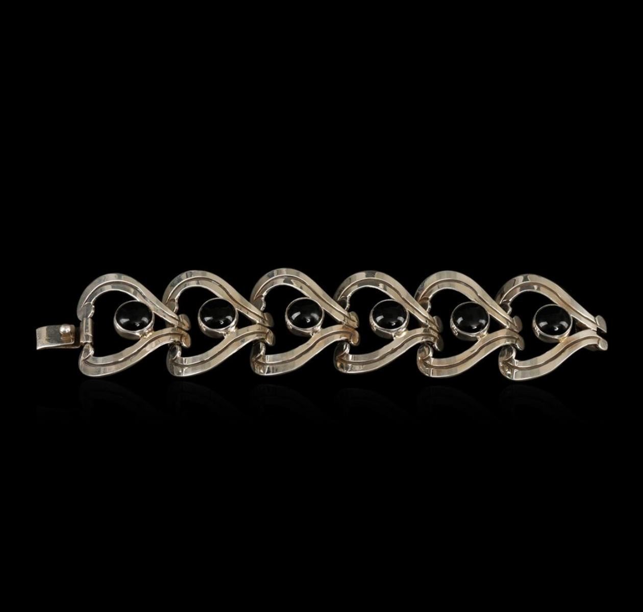 One of a kind high fashion sterling silver Bracelet weighing 73.7 grams. Black Antique texture on links. Containing: Black Onyx. This sterling silver promises a lasting shine.