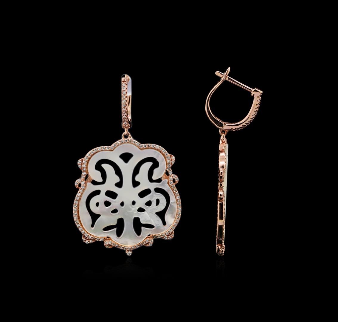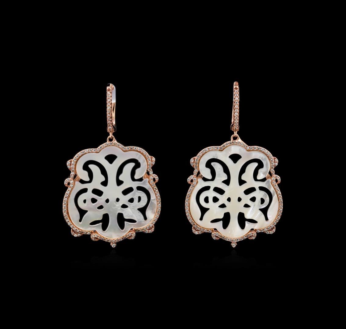 One of a kind high fashion sterling silver Earrings weighing 11.5 grams. Containing: Mother of Pearl, Cubic Zirconia. This sterling silver promises a lasting shine.