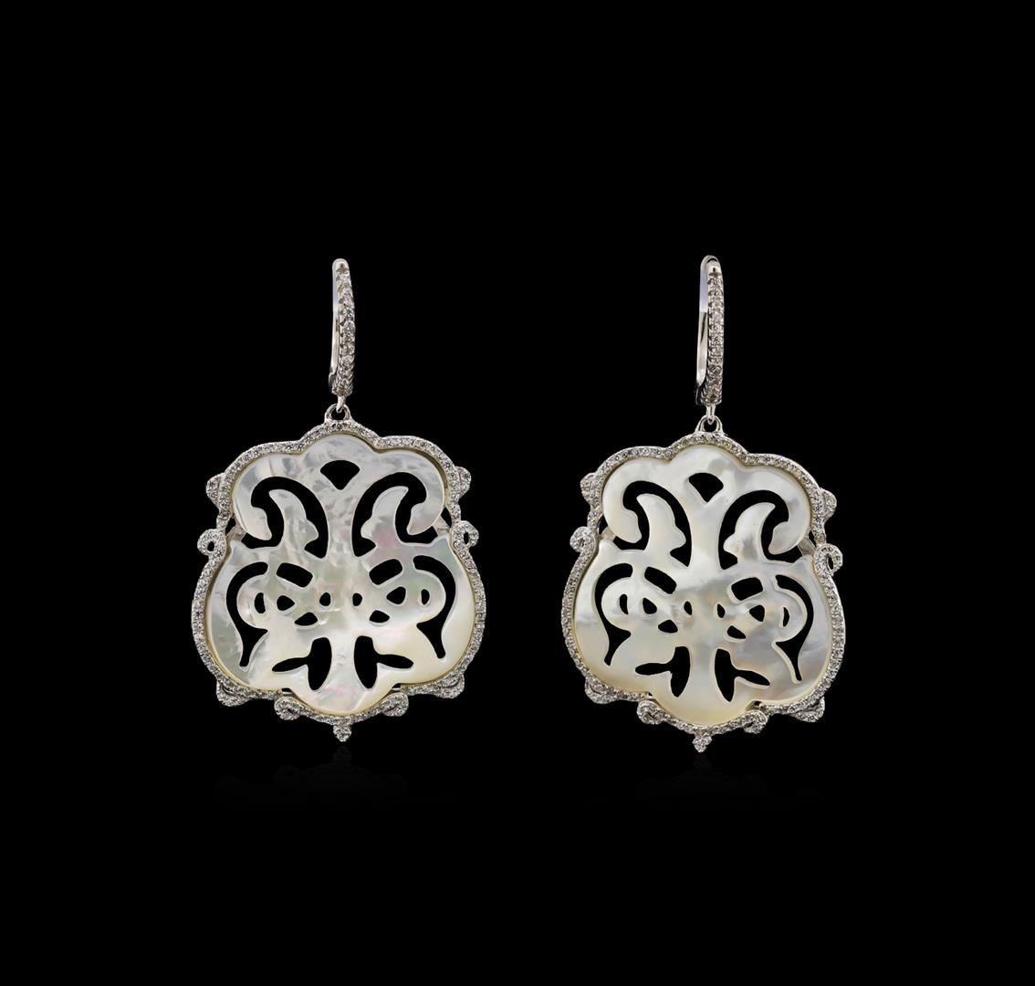 One of a kind high fashion sterling silver Earrings weighing 11.5 grams. Containing: Mother of Pearl, Cubic Zirconia. This sterling silver promises a lasting shine.